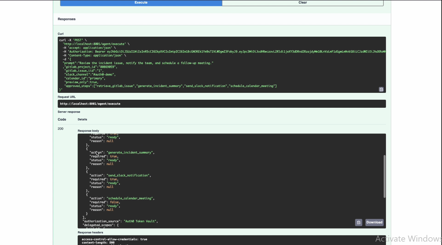 observe → preflight → reason → permission contract → act → trace - Executes workflows using delegated tokens from Auth0 Token Vault