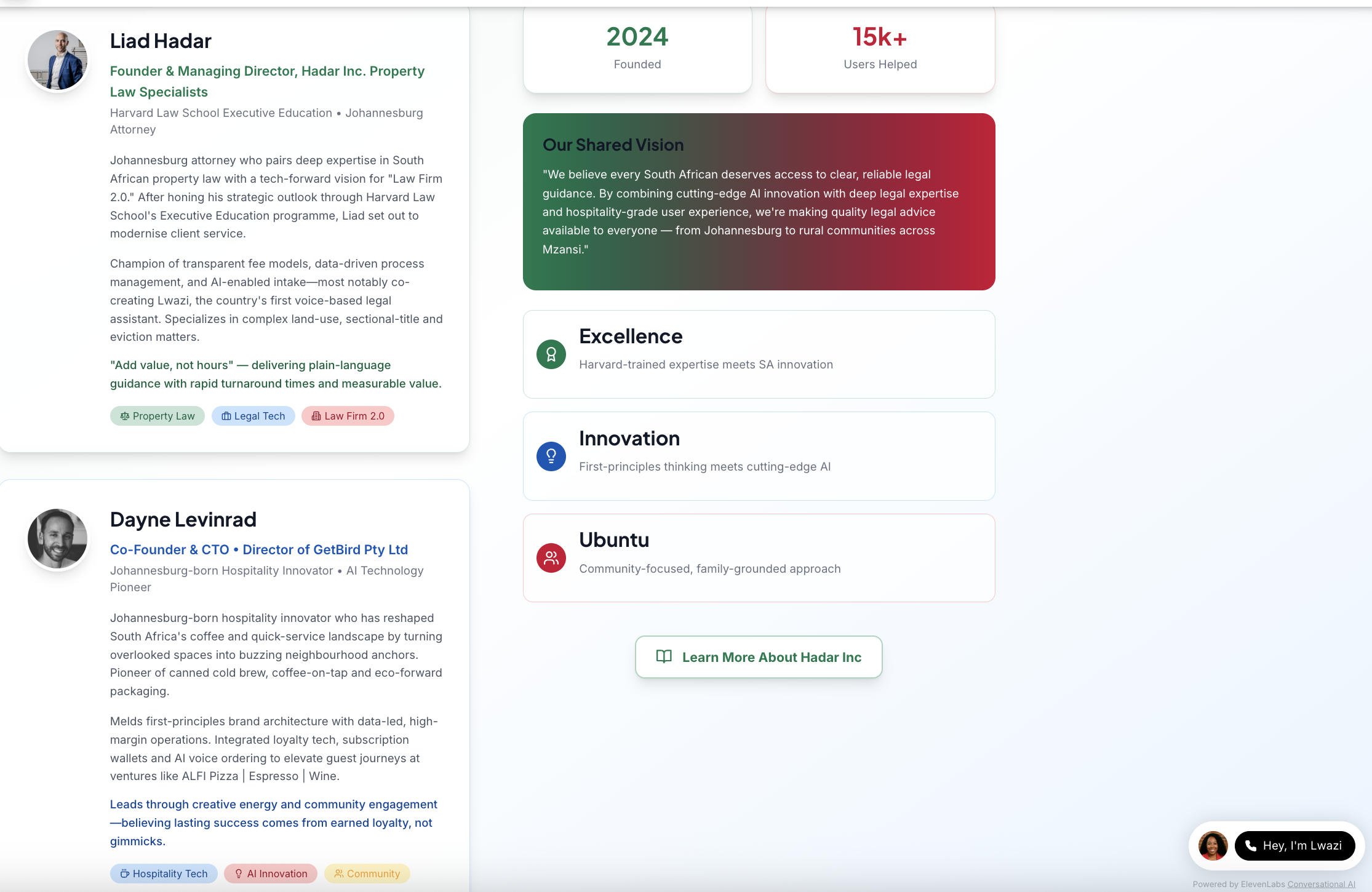 Lwazi is South Africa’s first voice-based AI agent built specifically for Property Law. She speaks, listens, understands, and guides users through common legal processes. She: • Answers client calls directly (+27 060 042 8851) • Collects contact details and matter summaries • Clarifies legal issues through structured conversation • Provides jargon-free explanations of legal steps • Summarises the call and sends the information to the Hadar legal team for follow-up • Lives both on our website (www.hadarinc.co.za) and as a phone-accessible AI