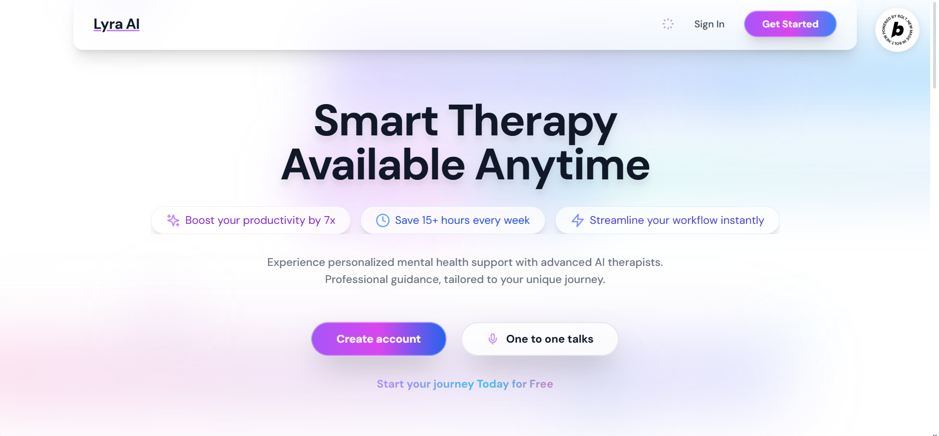 Inspiration The idea for Lyra AI came from something personal. We saw people around us struggling with anxiety, loneliness, and the weight of thoughts they didn’t know how to share. Even those who wanted help often couldn’t afford therapy or didn’t feel comfortable opening up to a stranger in a clinical setting.