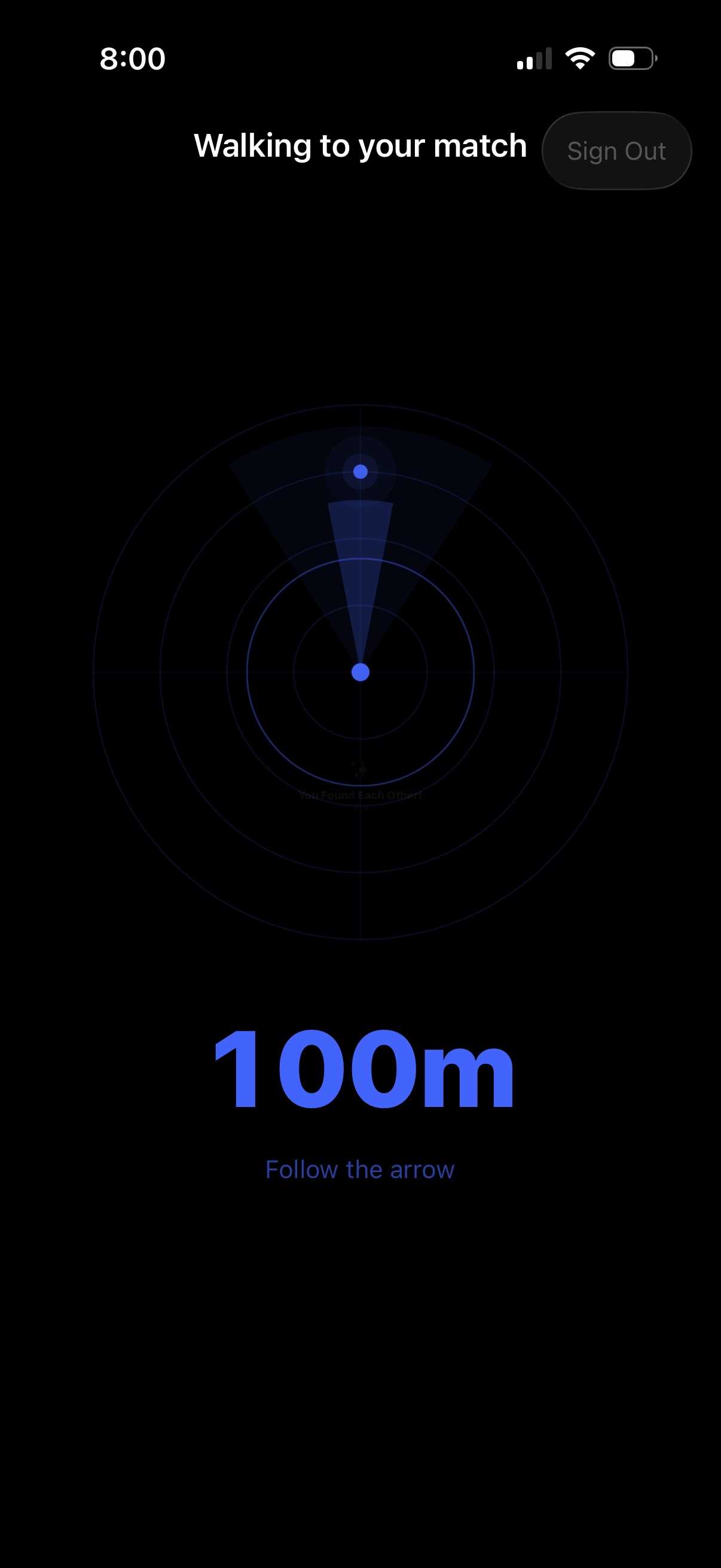 Once both users confirm the match, the radar screen opens. Both phones join a Supabase Broadcast channel keyed to the match ID and broadcast their GPS coordinates every second. We compute haversine distance and bearing client-side, directly in the app. GPS distance is smoothed using an exponential moving average ($\alpha = 0.15$) to eliminate the jitter that makes raw GPS unusable at close range.
