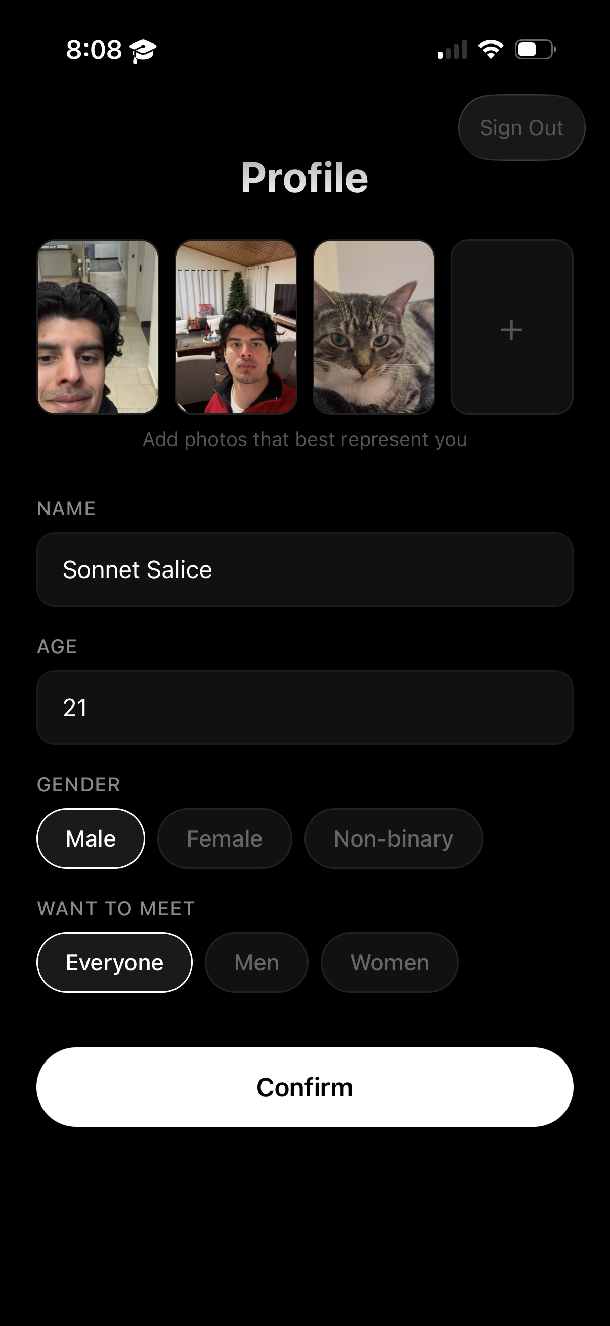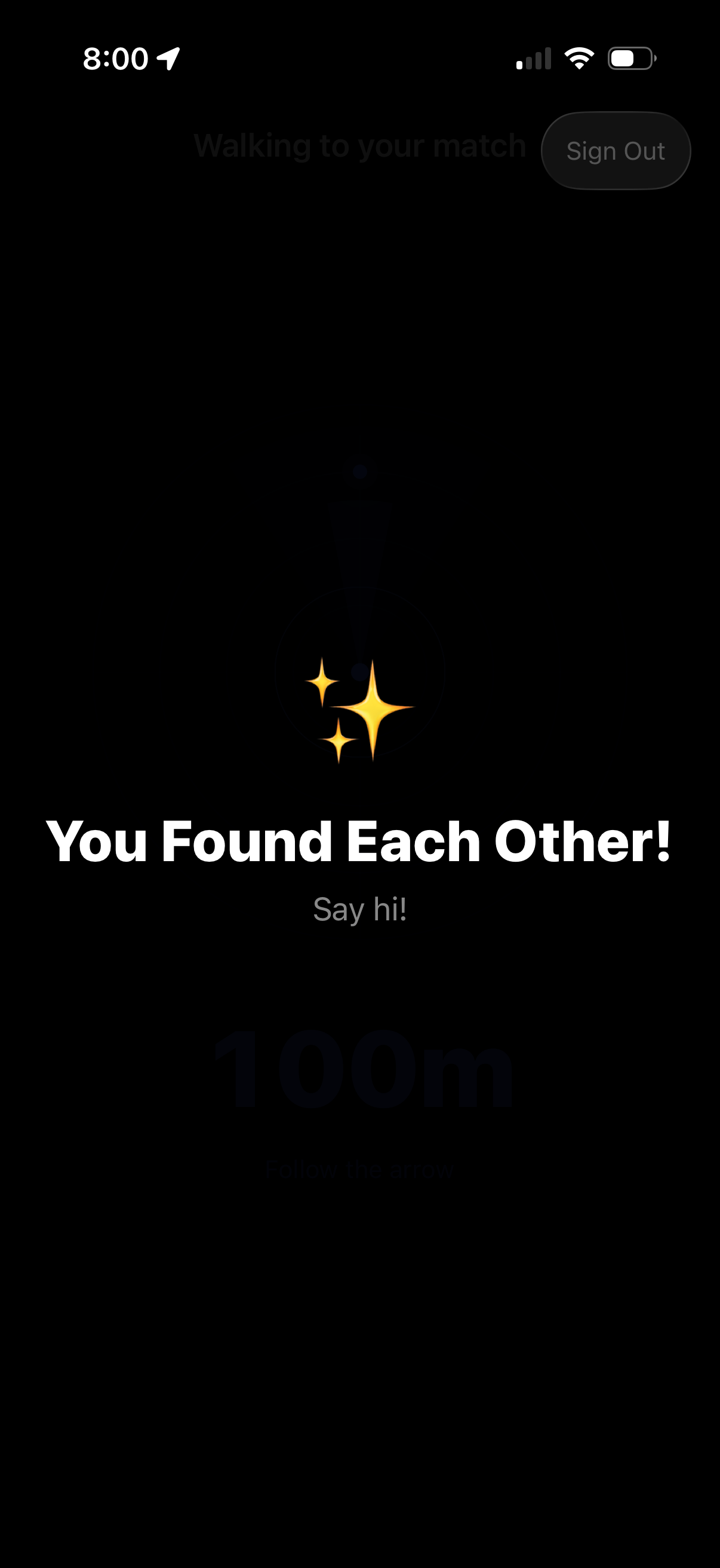 You find each other. A live radar guides you to within 15 meters using GPS broadcast over Supabase Realtime channels, then Bluetooth proximity detection closes the gap. Confetti. Haptics. Go say hi.