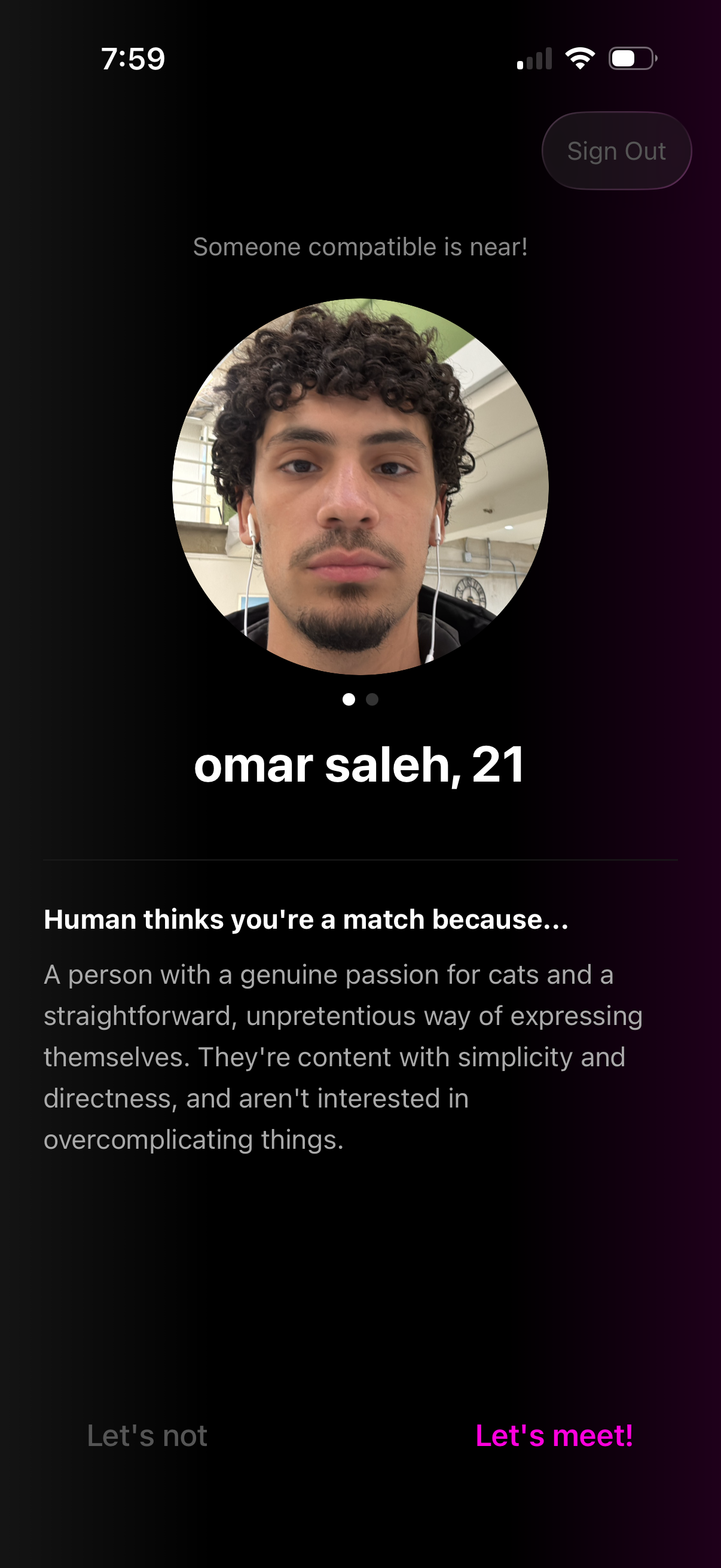 Human is a proximity-based AI matchmaking app for iOS. Not for dating. Not for networking. Just for meeting the person you were probably supposed to meet.