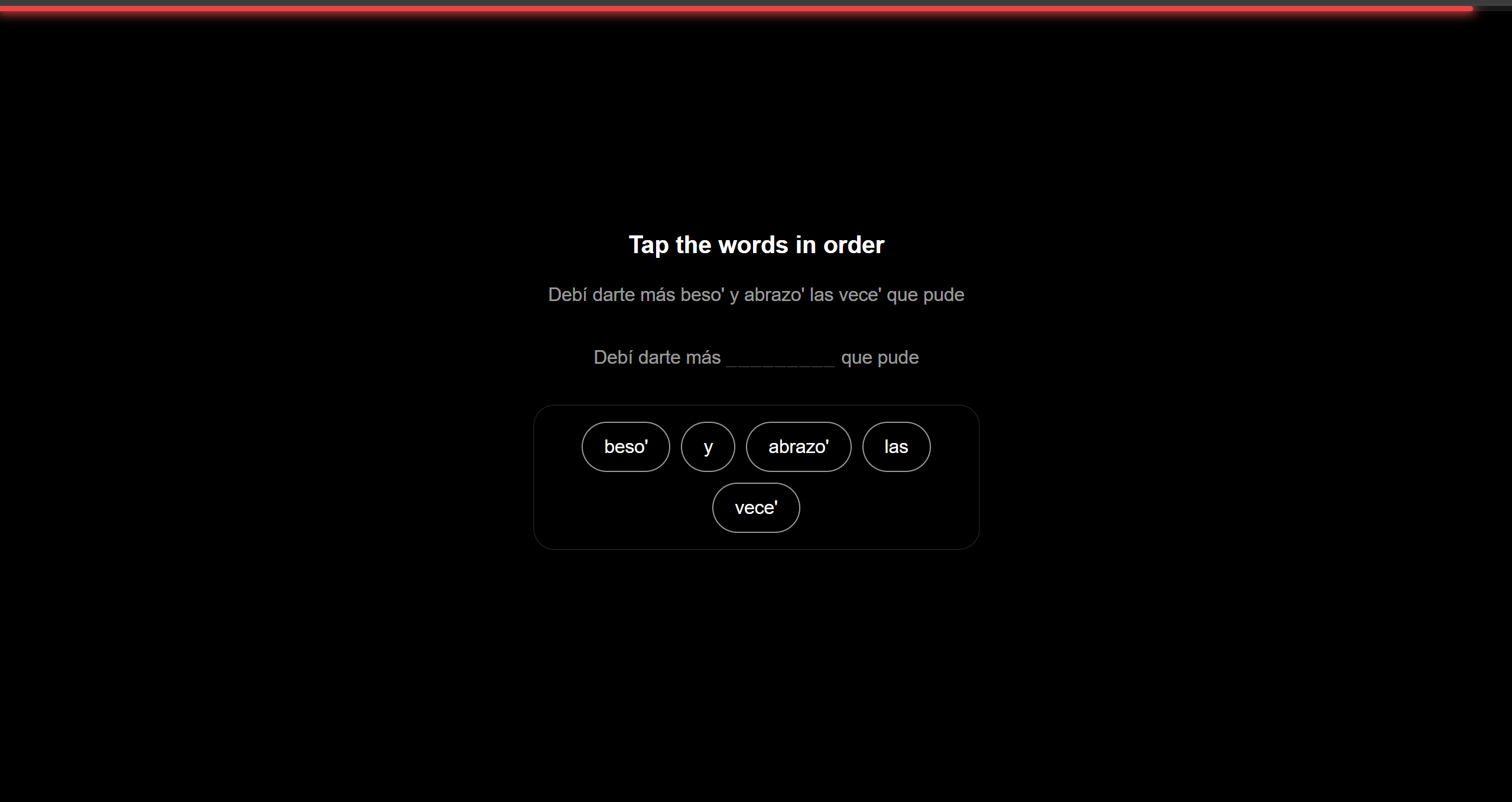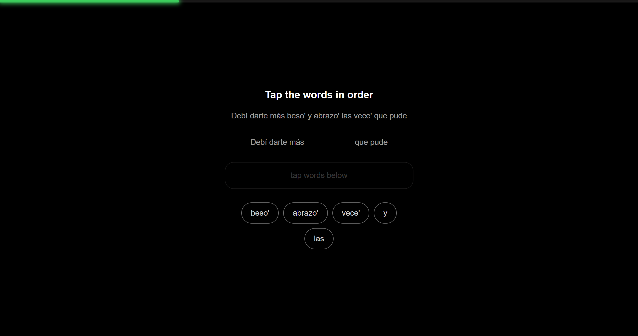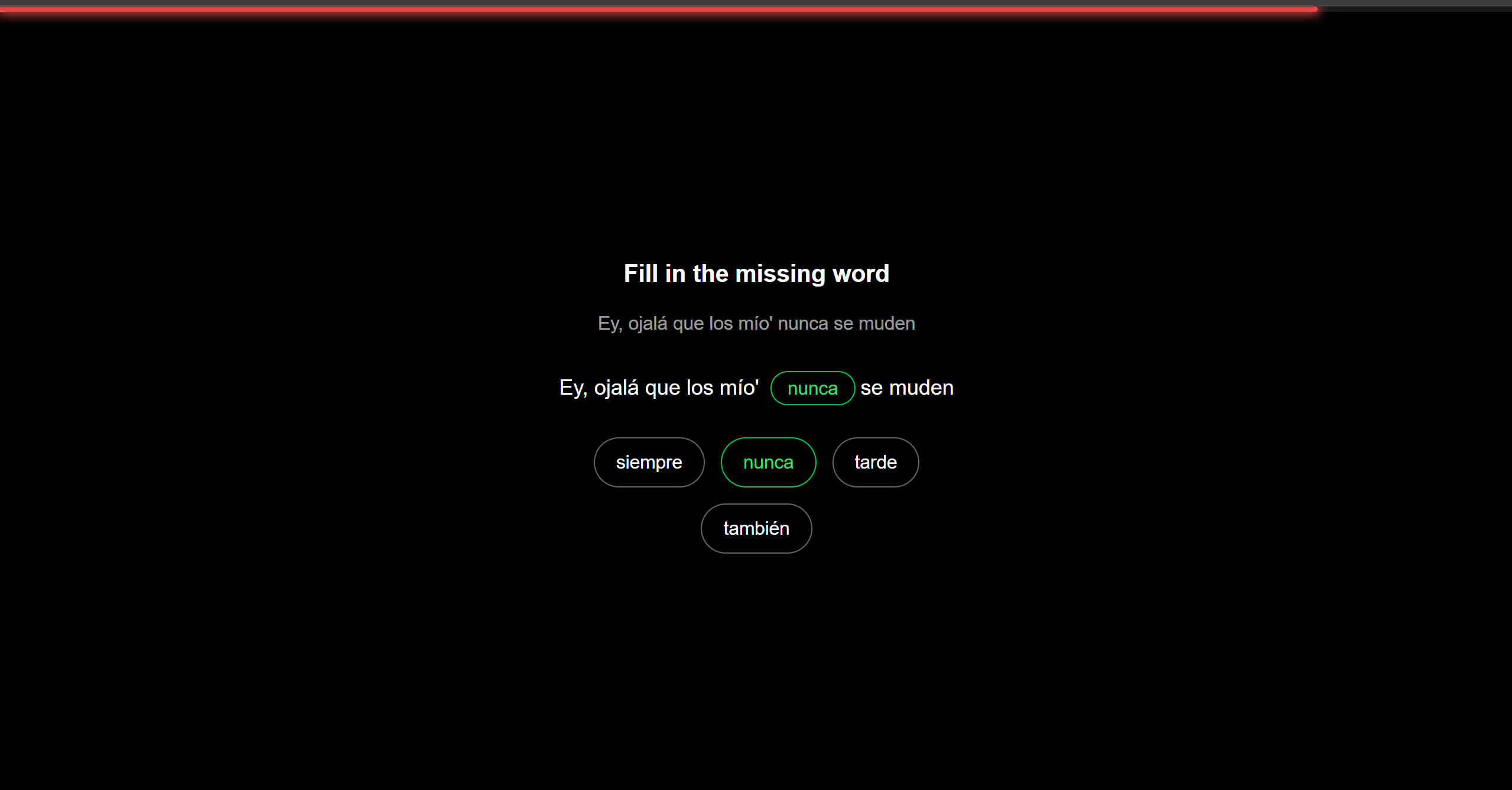 The Apple Music lyric view is the thing we're most proud of technically. The progressive opacity fade, the active line anchored at 35% from the top of the scroll container, the background color shifting to match the album art — it took real iteration to feel as natural as it does. More than the visual, we're proud that the core loop is genuinely fun to play. The moment the song pauses and the exercise slides up has a satisfying quality — the music world is still there, blurred behind the card, and the only thing between you and hearing the next line is answering one question correctly. That tension is the product, and it works.