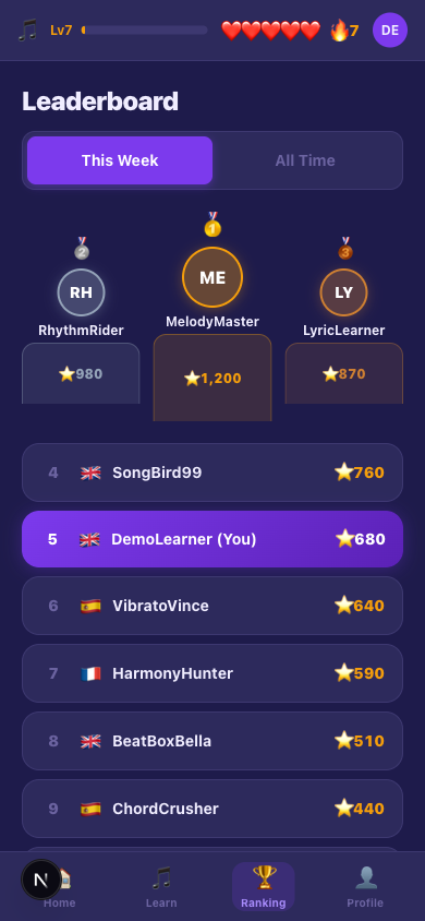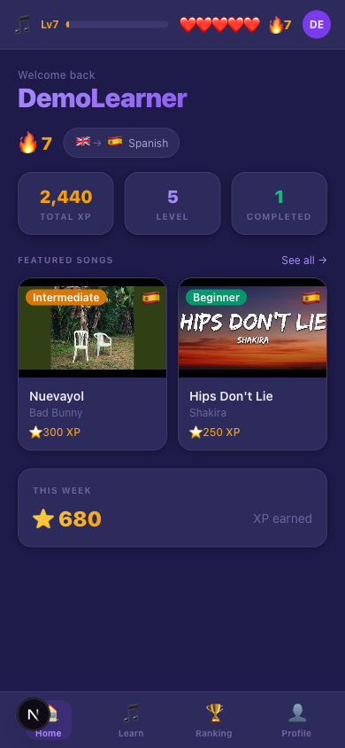 Lyric2Lang plays a song in your target language and pauses it line by line, turning each lyric into a micro-exercise before the music continues. You pick your language pair — Spanish to English, French to English, English to French, any of the six combinations — choose a song from artists like Bad Bunny, Stromae, or Katy Perry, and the app takes it from there. While a line plays, you see it highlighted Apple Music-style with a live translation below: the active line large and bold, upcoming lines fading in a cascade, past lines ghosted out. When the line ends, the player pauses and an exercise slides up — tap to match words, reassemble the translation from a word bank, fill in the blank, or identify what you just heard from four options. Get it right and the music resumes from exactly where it stopped. Every eighth line triggers a Lightning Round: 30 seconds of rapid-fire vocabulary matching scored against a countdown timer. XP accumulates with a combo multiplier, hearts track your accuracy, and a global leaderboard ranks you against other learners by weekly score. The full song library covers six tracks across three languages — Nuevayol and Hips Don't Lie for Spanish, Alors on Danse and Tout Oublier for French, Roar and Firework for English — with a library of locked songs signalling what comes next.