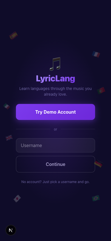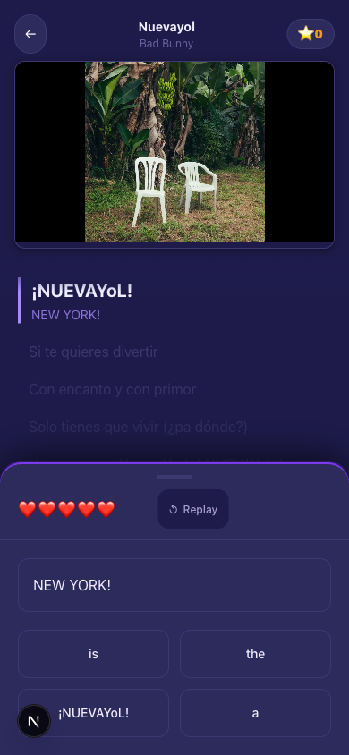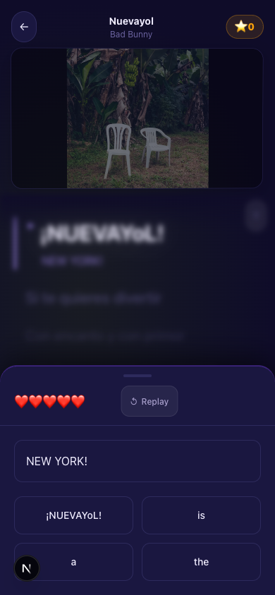 Language learning apps have a retention problem. You open Duolingo, tap through a few exercises about "the apple is red," close it, and forget everything by morning. The issue isn't motivation — it's that the content has no emotional hook. Meanwhile, you'll listen to the same Bad Bunny song forty times in a week and absorb nothing, because there's no structure forcing you to engage with the words. We kept thinking: what if those two things were the same app? The insight was that music already does the hard part — it makes repetition feel good. All Lyric2Lang had to do was attach the learning to the moment the line is playing, before you have a chance to tune it out.