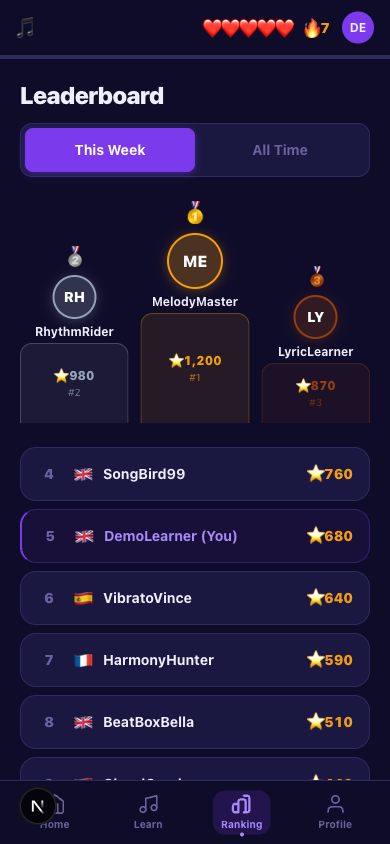 The architecture is already built to scale. Replacing localStorage with Supabase would take the leaderboard from seeded demo data to a real global ranking with persistent accounts across devices. The singing mode already has a "Coming Soon" slot in the UI — Web Speech API speech-to-text can match spoken words against lyric text for a full karaoke-with-grading feature without needing pitch detection libraries. A spaced repetition system layered on top of the session data would track which words a user misses across songs and resurface them in future exercises, turning passive exposure into lasting vocabulary retention. Word-level highlighting — individual words in the active lyric line lighting up one by one in sync with the audio, timed by dividing the line's duration by its word count — is the feature that would make Lyric2Lang feel fully native to music rather than attached to it. On the content side, the song library is designed to expand: the six demoable tracks are a foundation, not a ceiling. Korean with BTS, Portuguese with Anitta, Italian with Mahmood — each new language is a new artist relationship and a new learner demographic. Longer term, the Claude API integration opens an adaptive difficulty path: analyzing answer patterns over sessions to identify which grammar structures a user consistently misses and generating targeted exercise batches around those specific weak spots, rather than cycling through the same four exercise types in fixed rotation. The north star is a learner who finishes a song and realizes they've absorbed thirty words of a new language without ever feeling like they were studying.