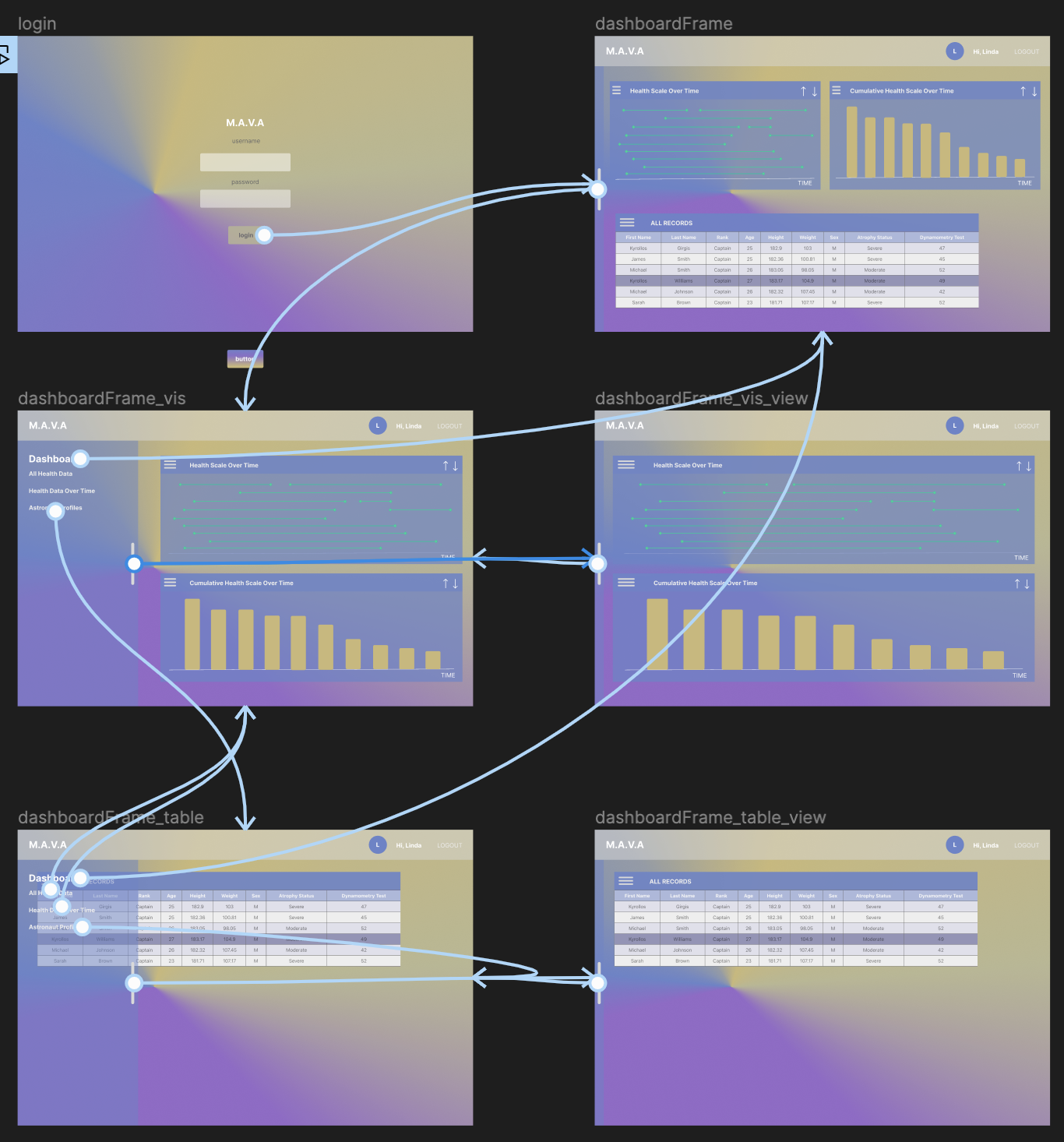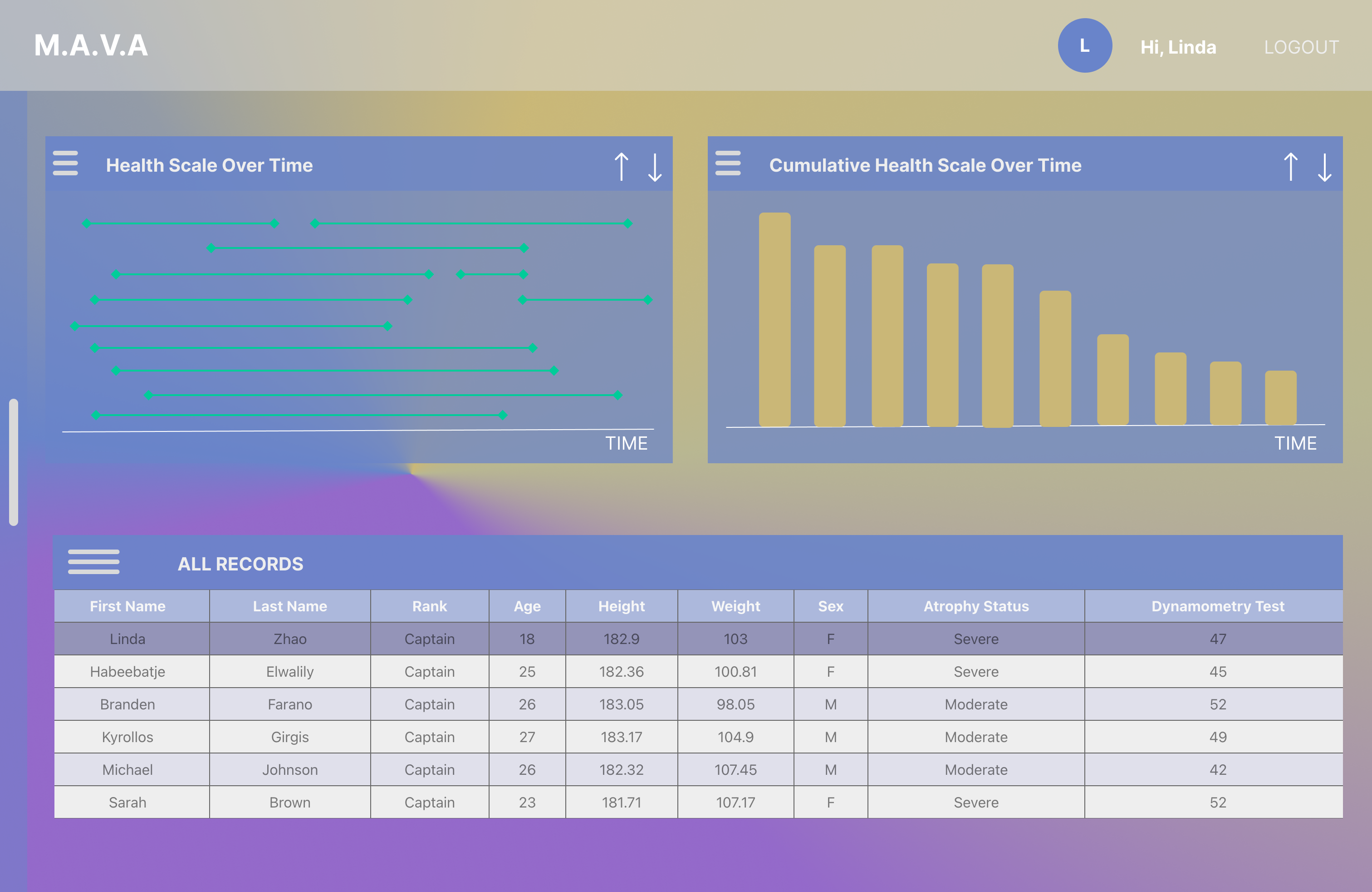 *UI/UX * We import ideas of Visual Analytics to the frontend dashboard. For better health management, astronauts should be cautious about the health level of everyone, as well as all possible influencing factors over time. Therefore, we designed panels, illustrating how the health status of each person, and a cumulative health scale counted as a metric over time. The data are free to order ascendingly or descendingly, for analyzers to pick those with best or worst healthy people for further exploration. There are also tables of all austronaut profiles, for a better overview of all information. We used Figma for designing and prototyping, and React.js for implementation.