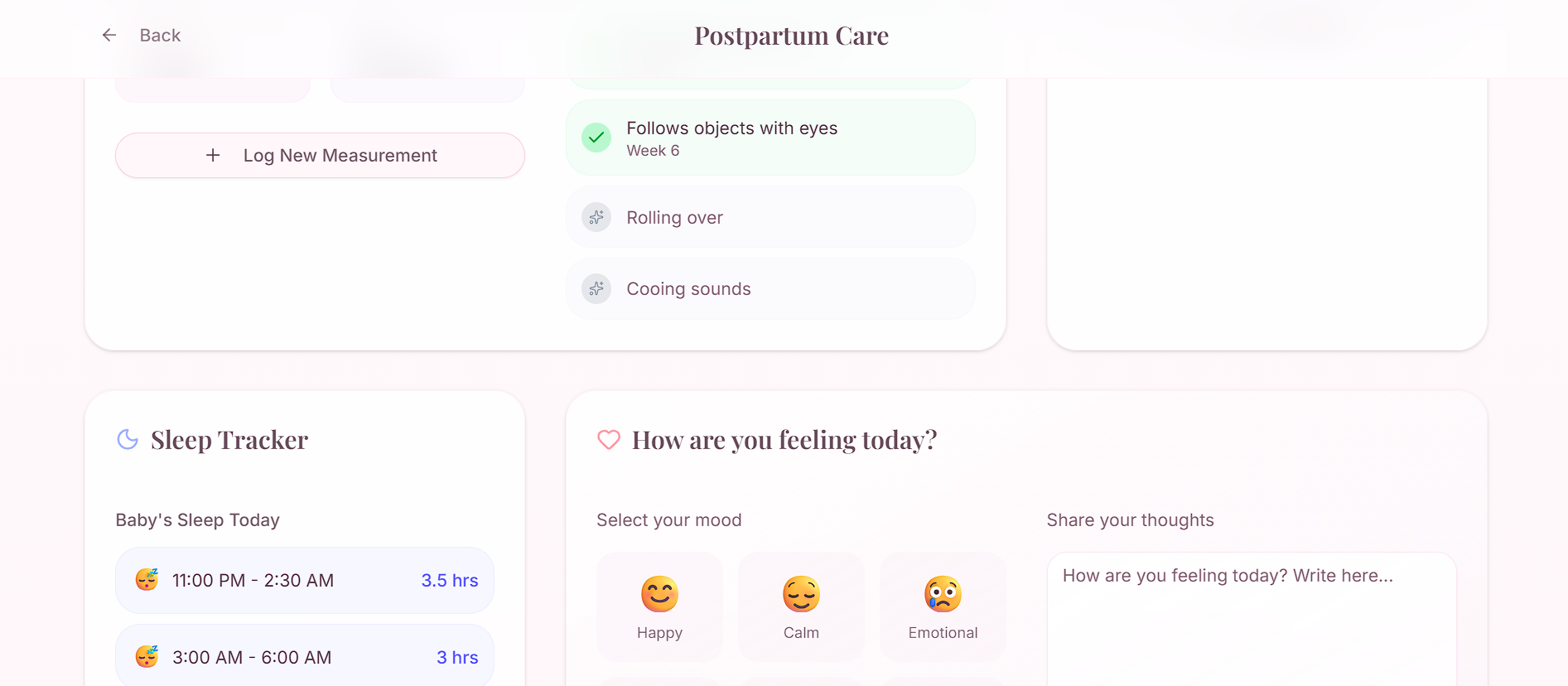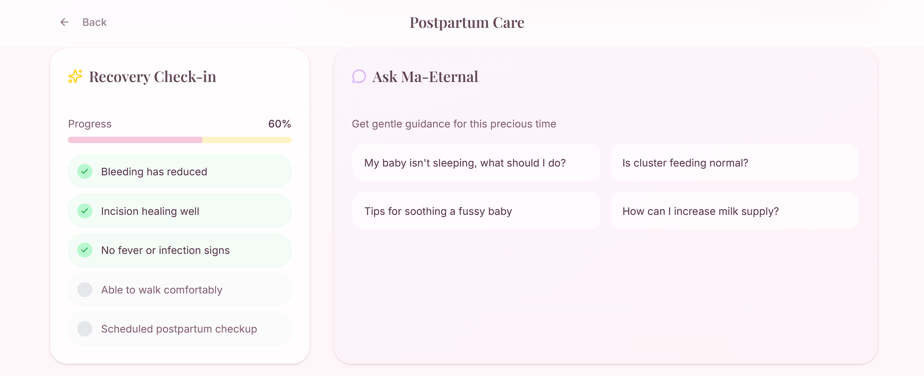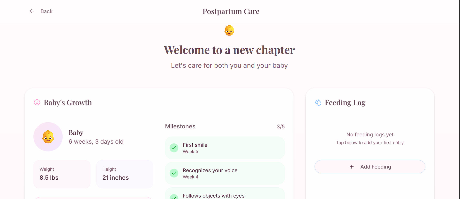 - Postpartum: Baby growth tracking, recovery support, and emotional wellness