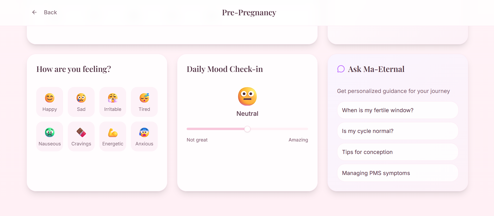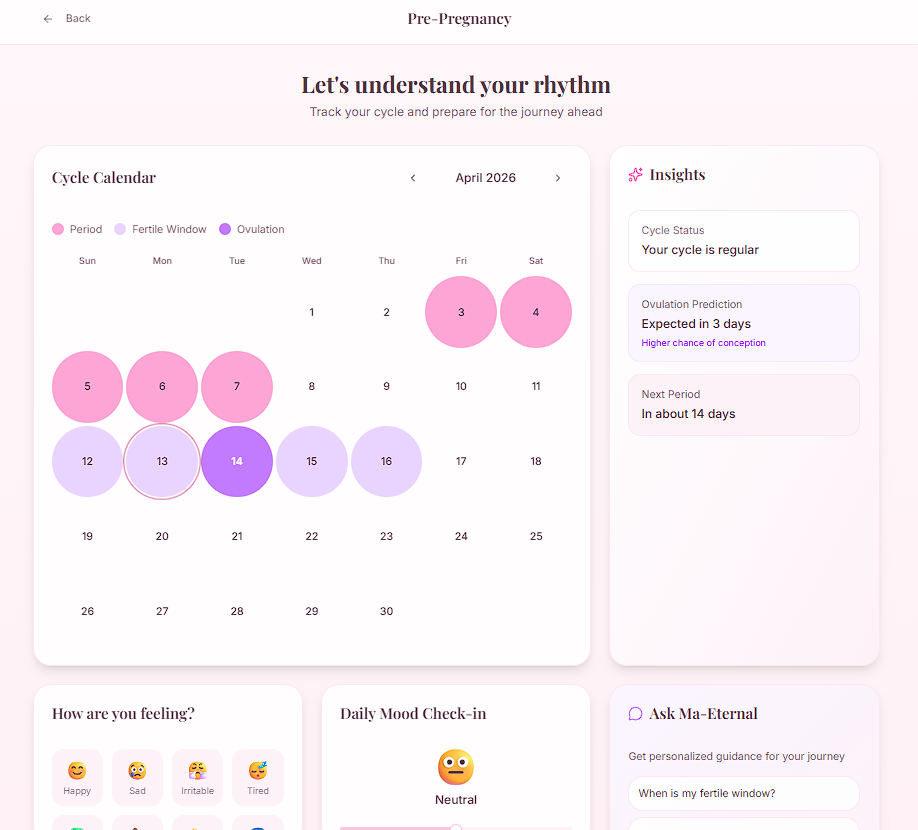 MaEternal was inspired by the idea that women don’t just need tracking tools, they need a calm, supportive companion that understands their physical and emotional journey across all stages.