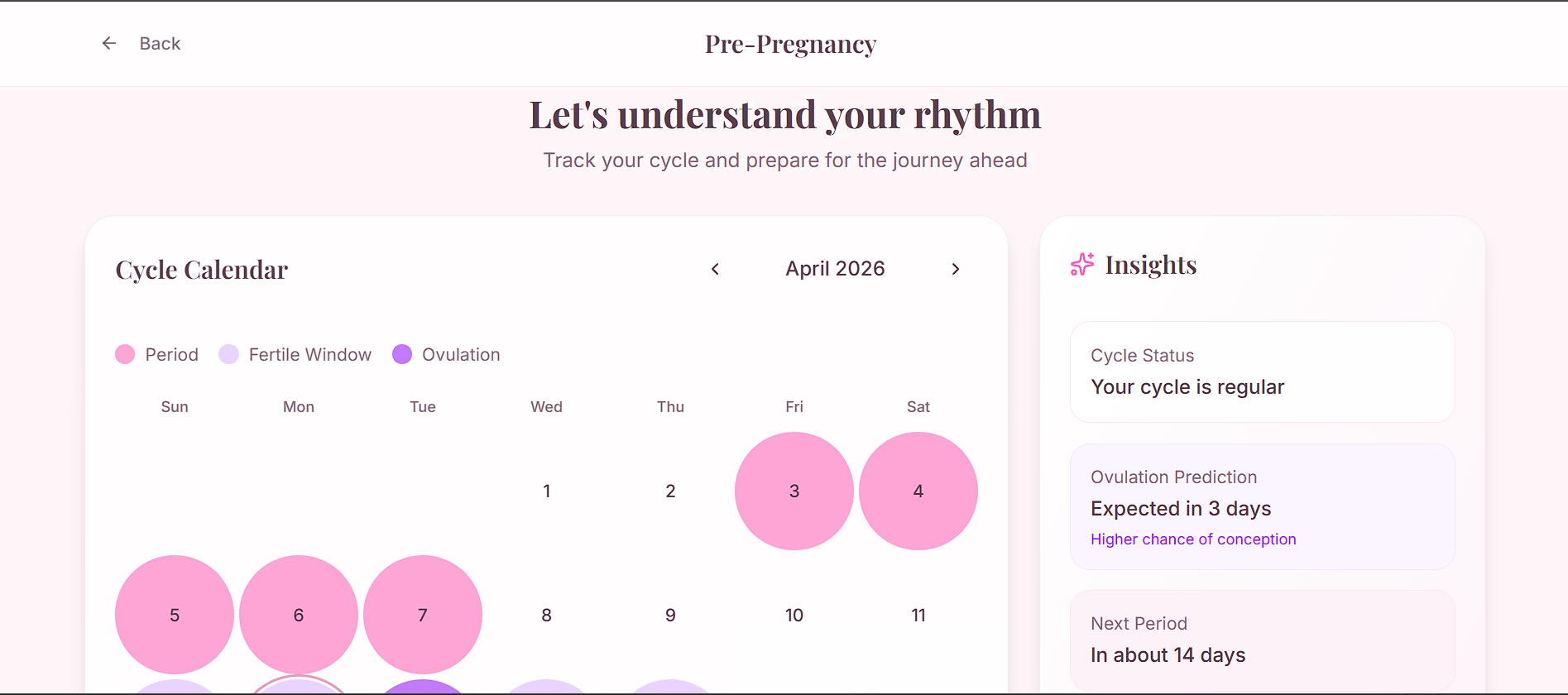 - Pre-Pregnancy: Cycle tracking, ovulation insights, and body awareness