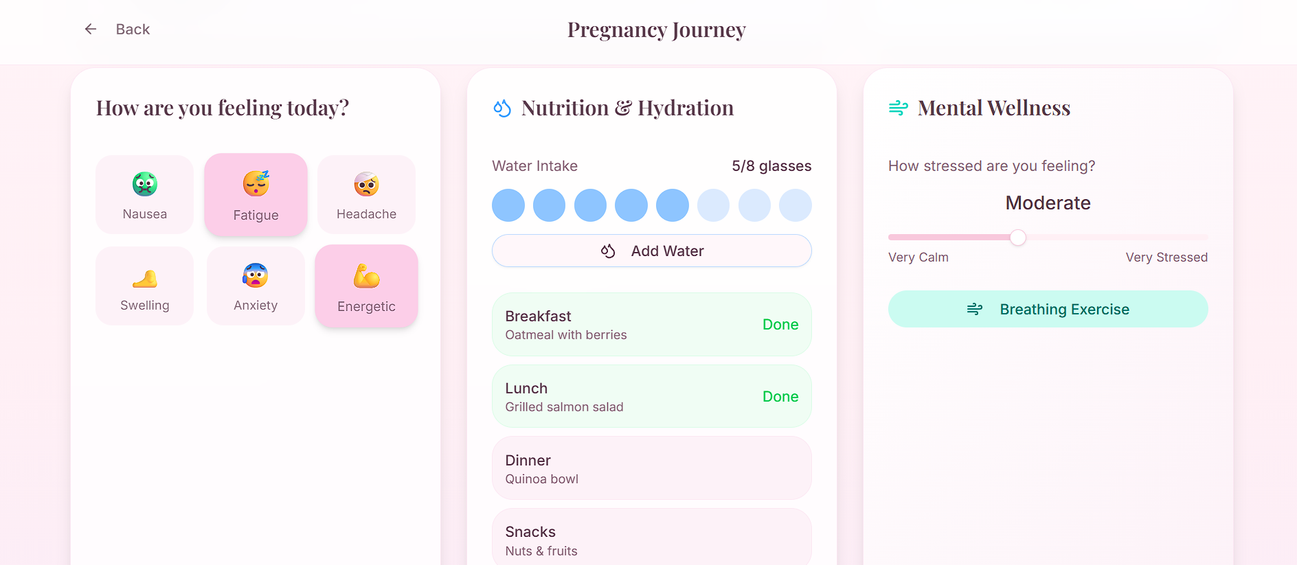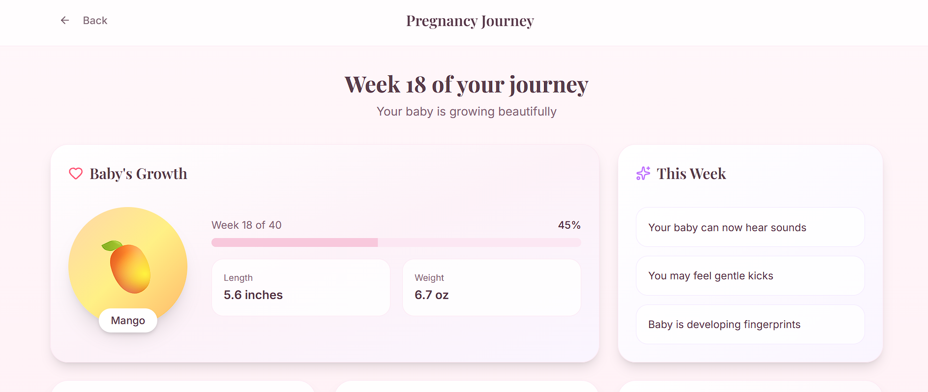 - Pregnancy: Week-by-week fetal growth tracking, symptom logging, and nutrition guidance