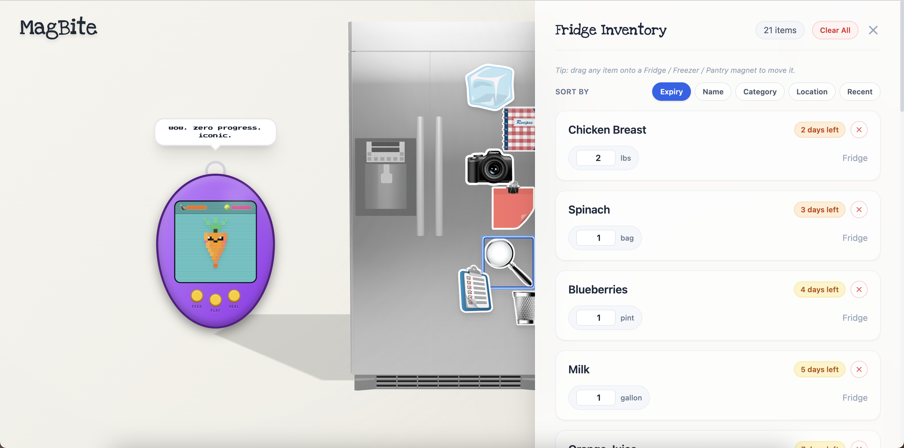 - auto sorts the food into 3 categories --- fridge, freezer, pantry. But you can drag and drop to sort yourselves as well.
