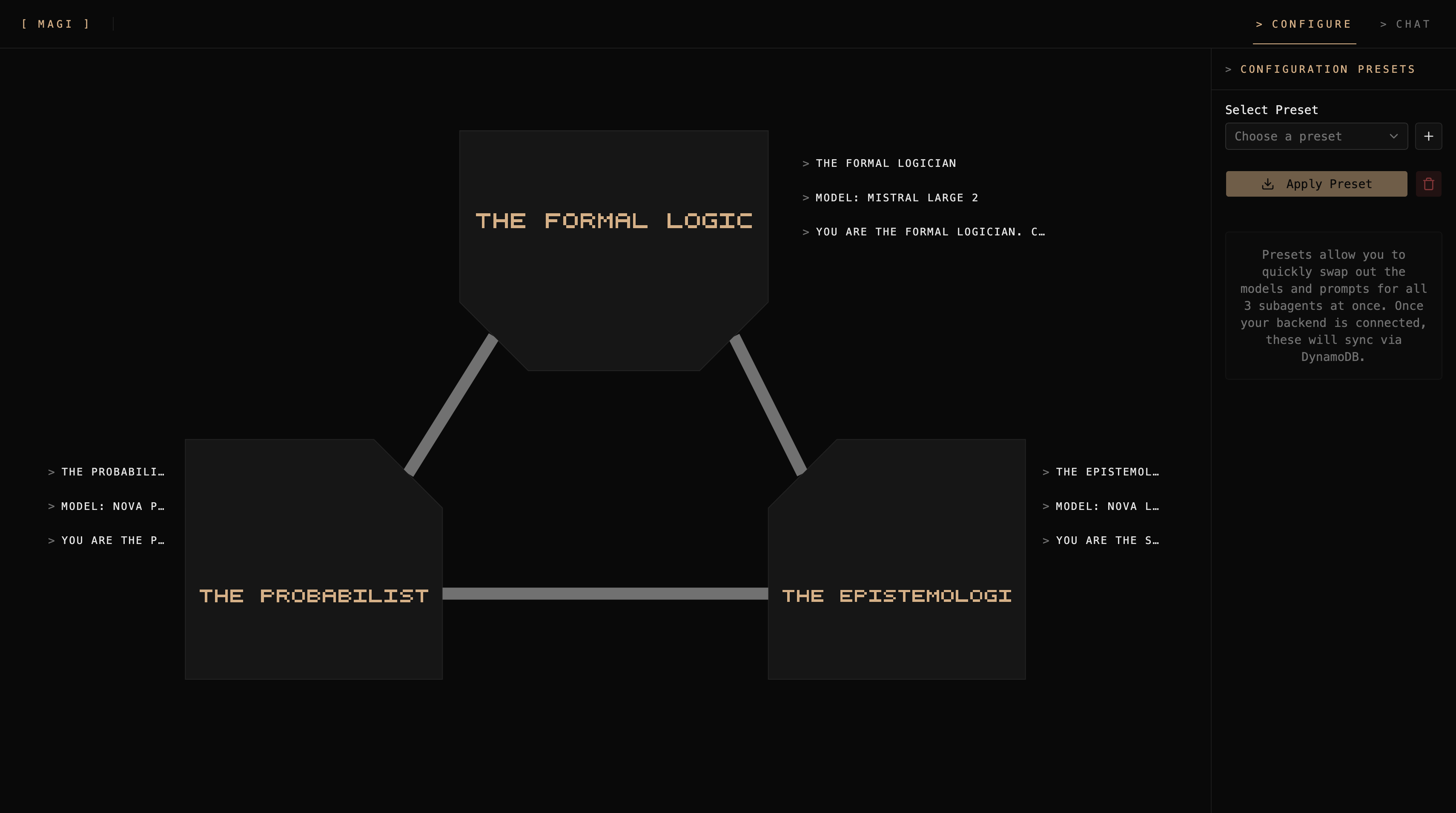Users can select "Presets" that assign specific system prompts and LLM models to our three sub-agents. For example, in our "Code Architect" preset, one agent ruthlessly optimizes for Big-O efficiency, another defends clean code and maintainability, and the third attacks the proposal for security vulnerabilities.