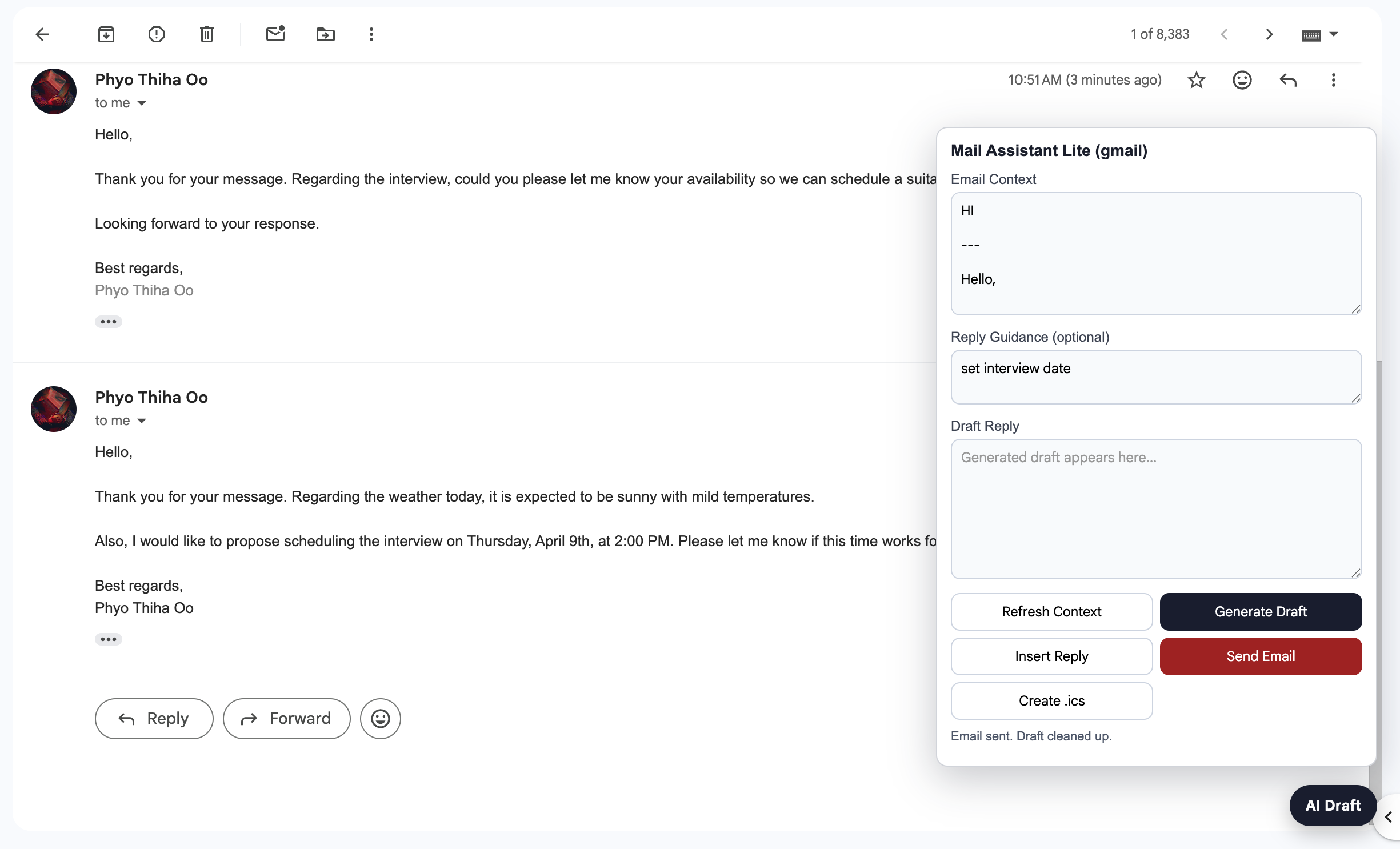 - Generates a contextual AI reply draft