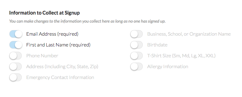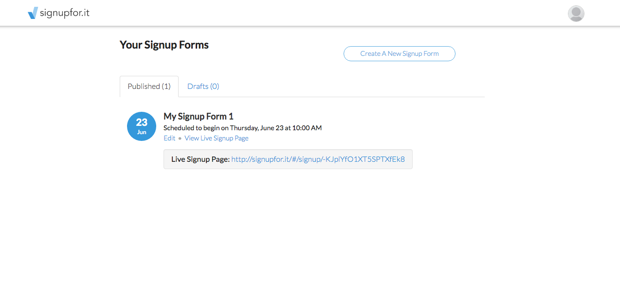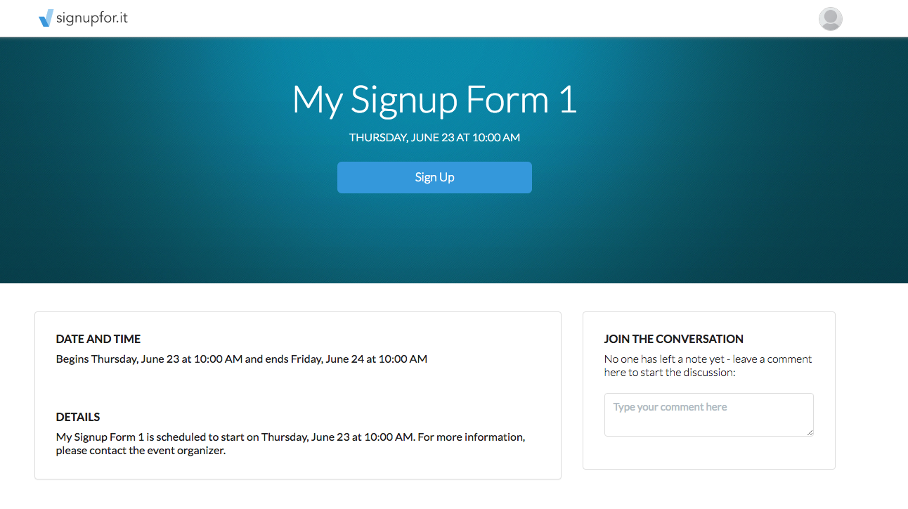 Signupfor.it makes it easy to create a signup form using minimal information. The signup forms are clean and add-free. Attendees can complete/submit sign-ups using their social media profiles (Google, Facebook, or Twitter) or email addresses.