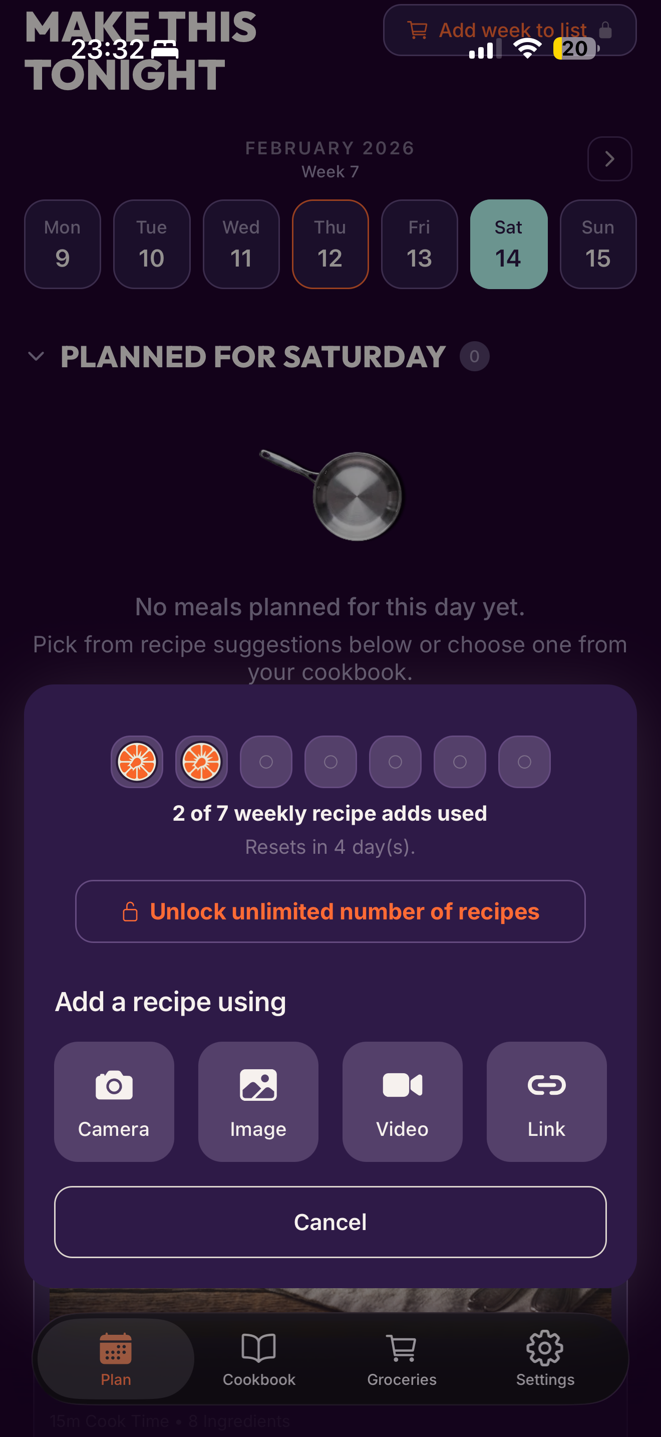 I've built it with Expo for future cross platform support. Backend is Supabase + Gemini AI models for recipe extractions. I've started of with a basic working concept for adding recipes and viewing them. After that I added the Planing section and Recipe suggestions. Grocery followed last. In between was looking for different sources of inspiration for the UI design.