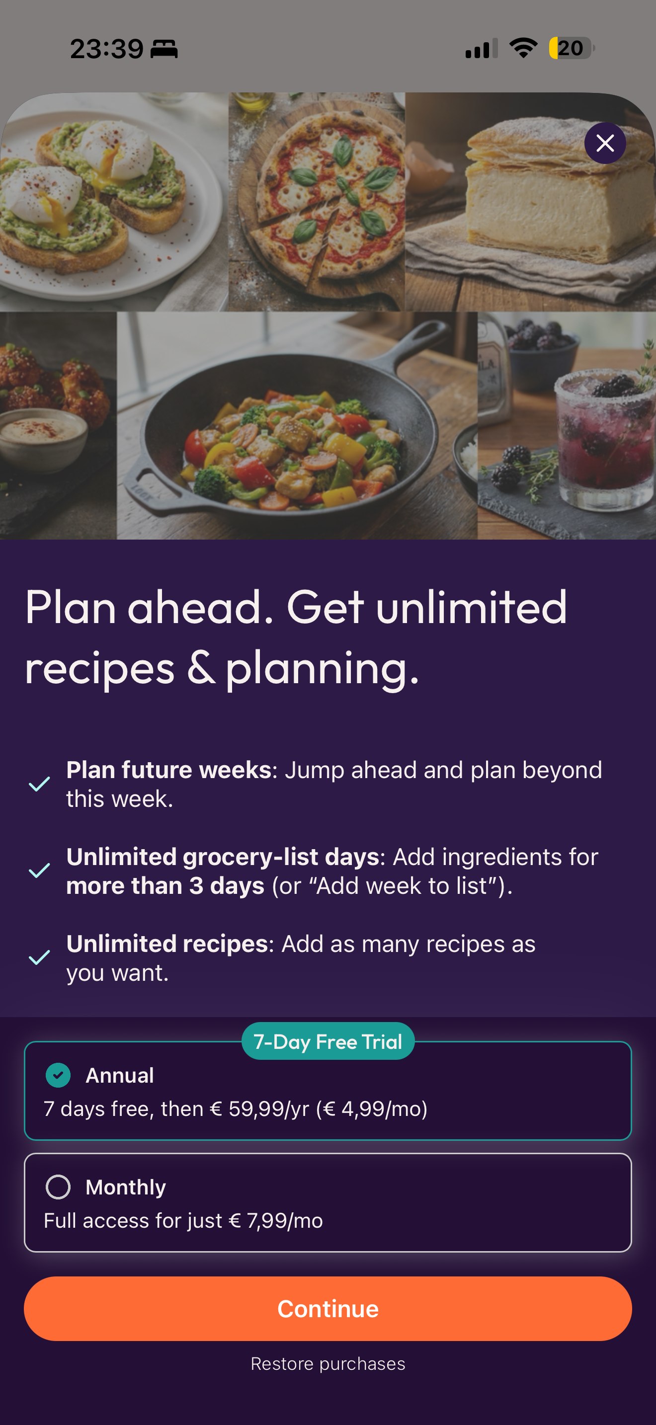 Adding a new recipe modal (free user)