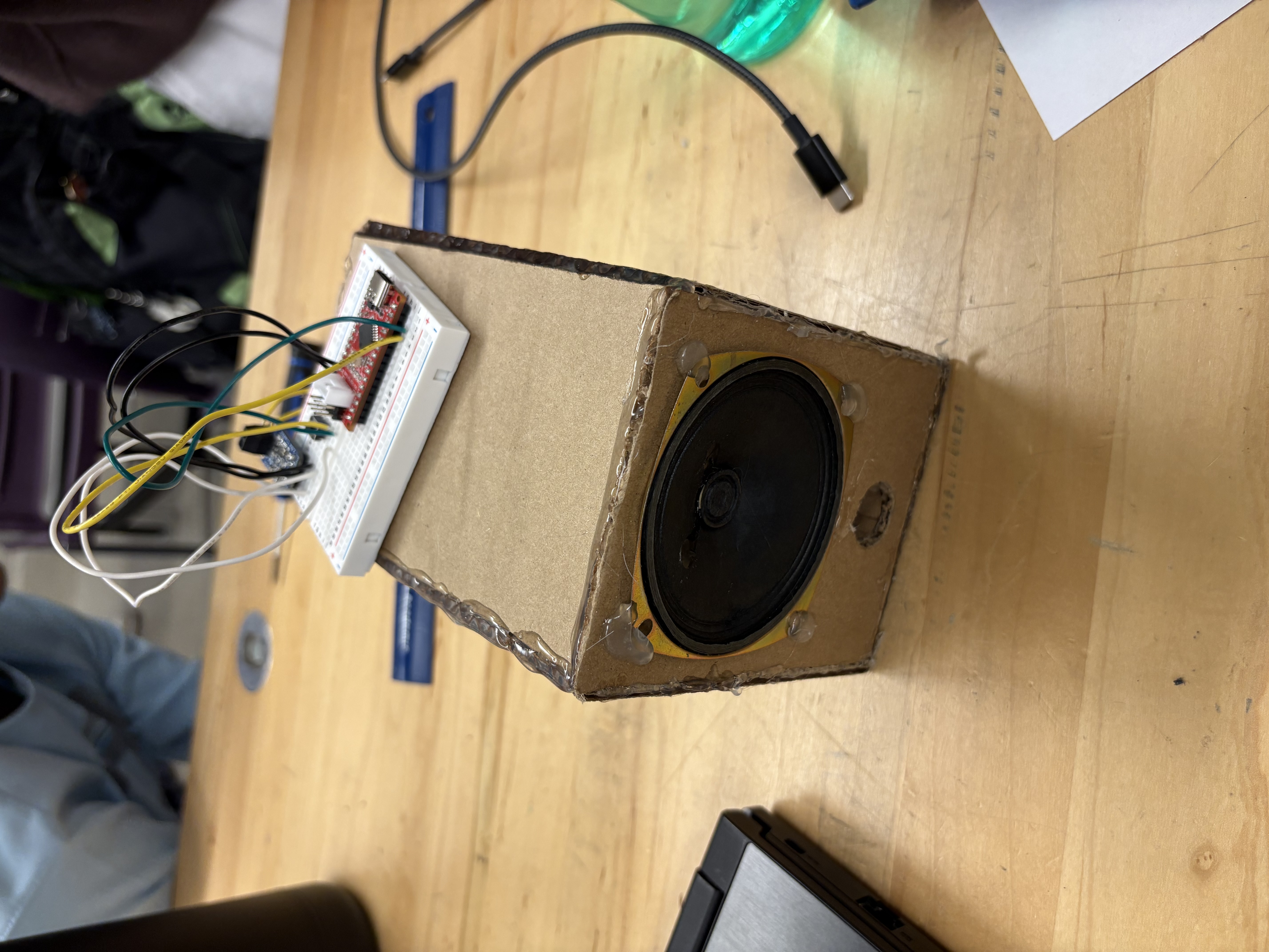 A makeshift speaker designed and built over the course of 7 hours! It is capable of producing sound around 80 dB at a distance of 1 metre and won the 2025 Tron Day competition at the University of Waterloo.