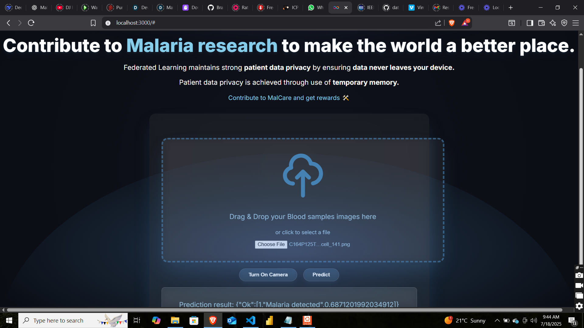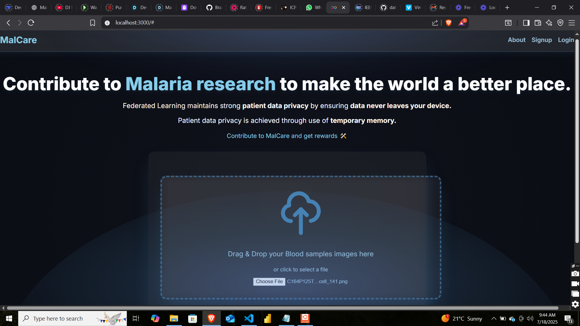 The MalCare project allows medical personnel to upload a blood smear images to the platform, where a trained machine learning model analyzes the image and predicts whether the sample indicates malaria infection or not. Additionally, the new model weights generated from unseen data are aggregated and securely stored in a central repository, ensuring integrity and protection against manipulation.