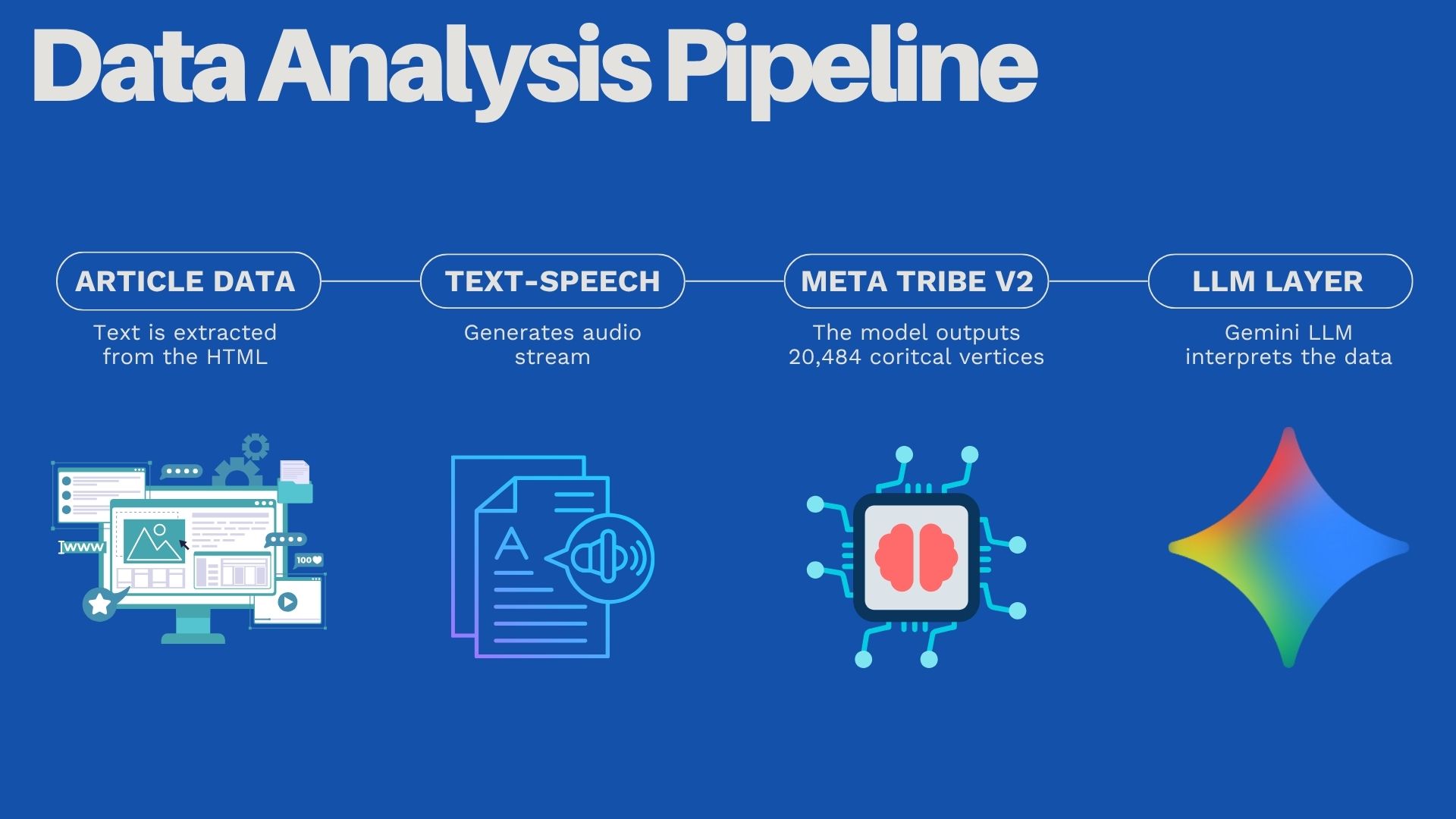 The biggest challenge was computational overhead. Running the pipeline end-to-end, especially text-to-speech, TRIBE v2 inference, and LLM synthesis, was much heavier than expected. We ran into memory issues, long processing times, and timeout problems between the frontend and backend.