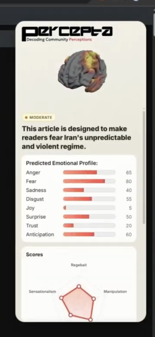 We built Percepta because we wanted to make that hidden layer of influence visible. For us, Code for Community meant building a tool that protects the shared information communities depend on. Instead of only asking what is this article saying, we asked; how is this article trying to shape our perceptions?