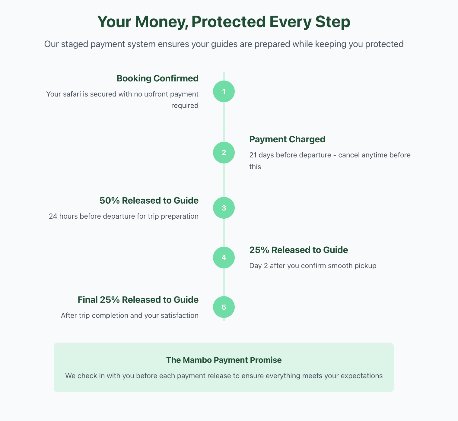 - Stripe payments with staged releases (50% upfront, 25% Day 2, 25% completion)