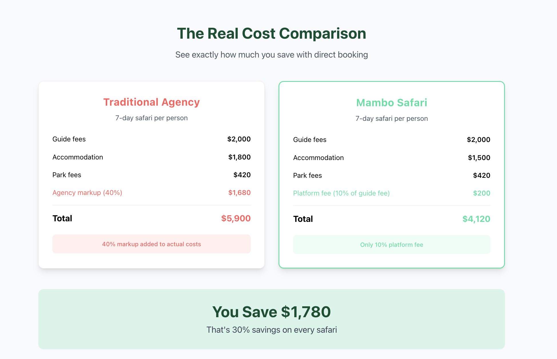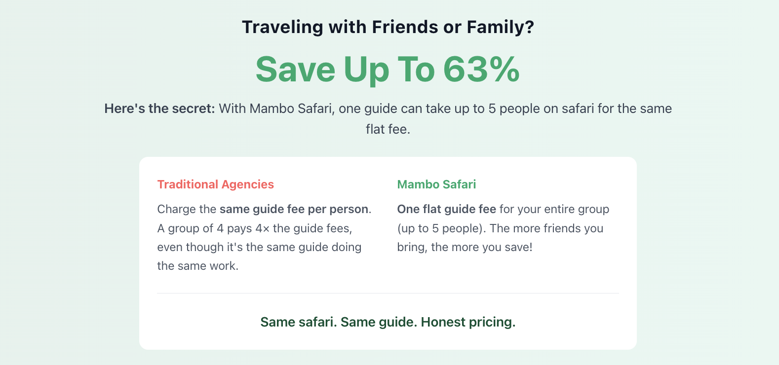 Same safari. Same guide. Honest pricing.