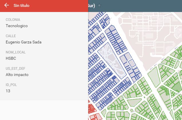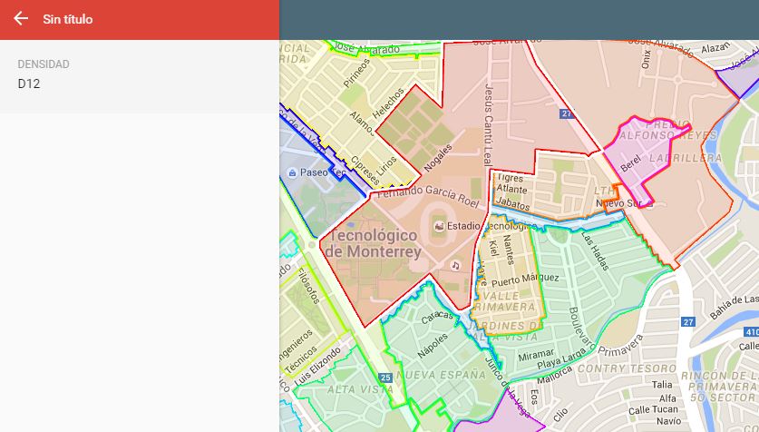 Son mapas individuales que se encuentran divididos por terreno o zona de las colonias que componen Distrito Tec. Al darle clic a un terreno, te muestra su información de uso de suelo, localización; si es un negocio, el nombre del negocio, etc. Estos datos se pueden modificar utilizando la herramienta Google My Maps la cual es más amigable que utilizar archivos GIS. Además, los terrenos se encuentran alineados con una visión del mapa real de Google Maps.