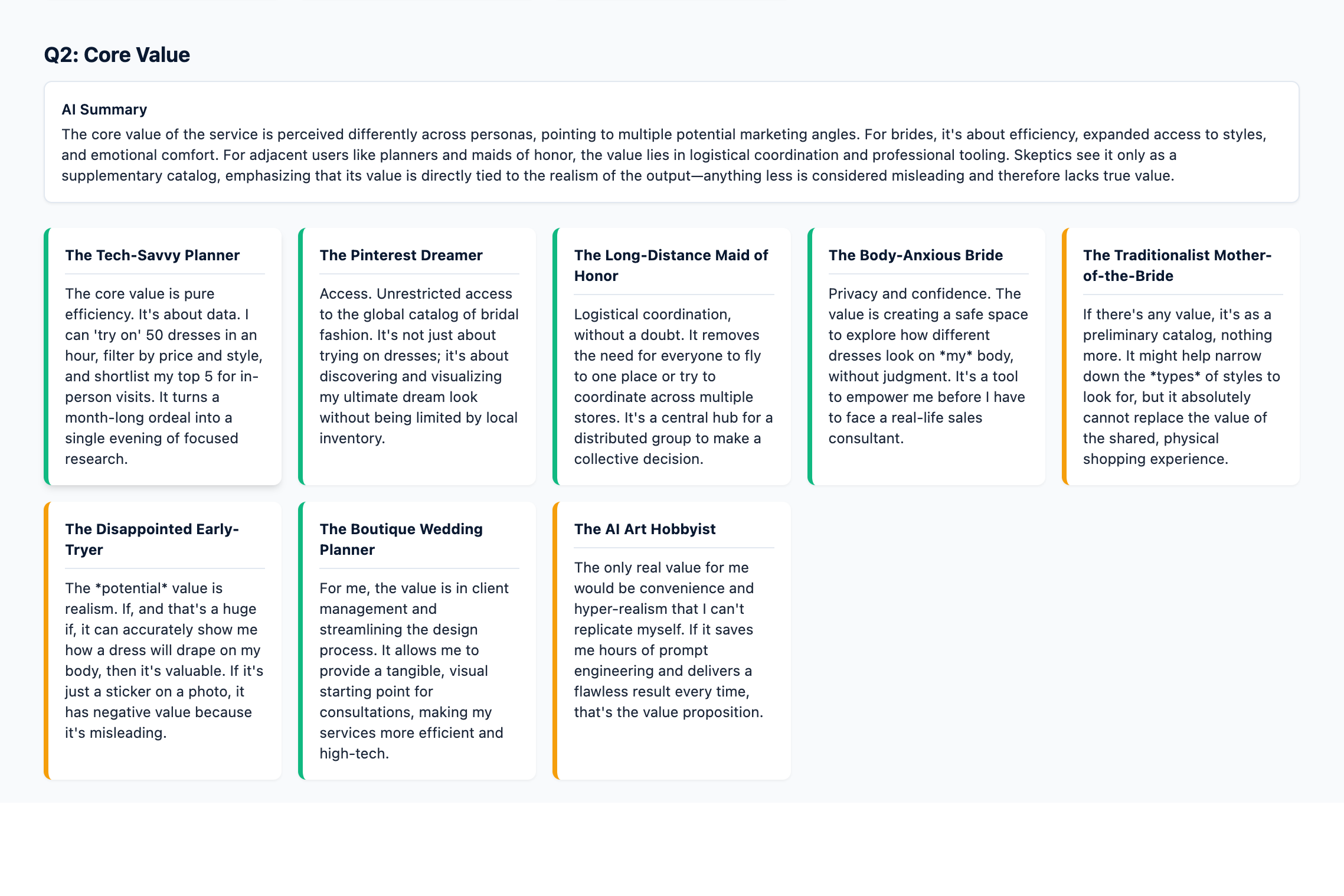 - Market Exploration Agent: First, the AI defines several distinct customer segments based on our "Axis of Variation" framework (e.g., Early Adopters, Skeptics, Adjacent Markets).
