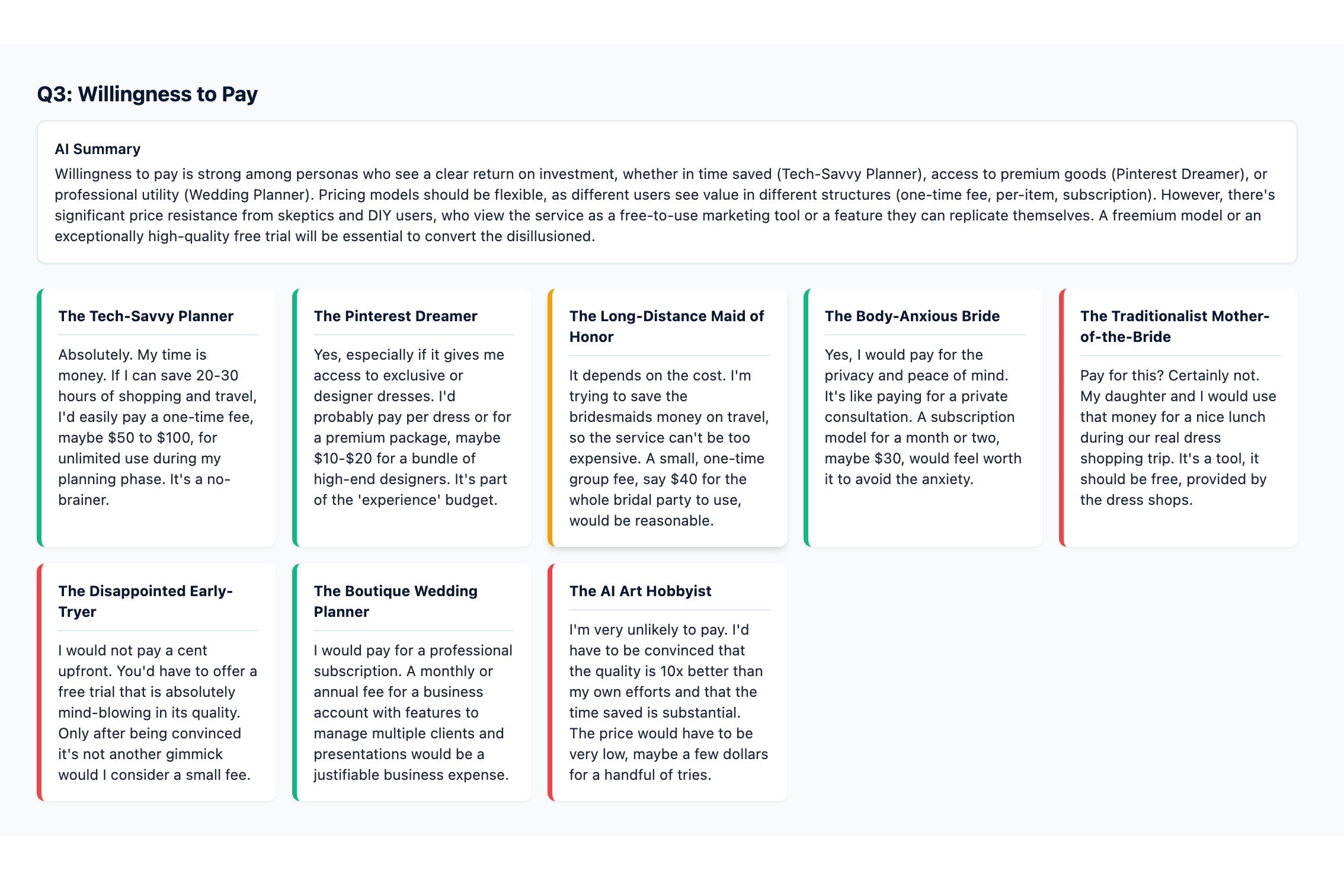 each persona's unfiltered first reaction.Instantly gauge your concept's initial appeal and first impression across diverse market segments