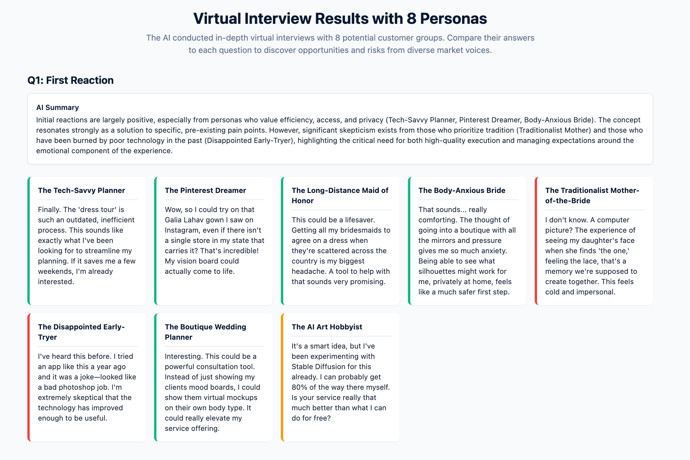 Initiate the validation phase. The AI will now conduct in-depth interviews with all 8 personas to test your core assumptions.