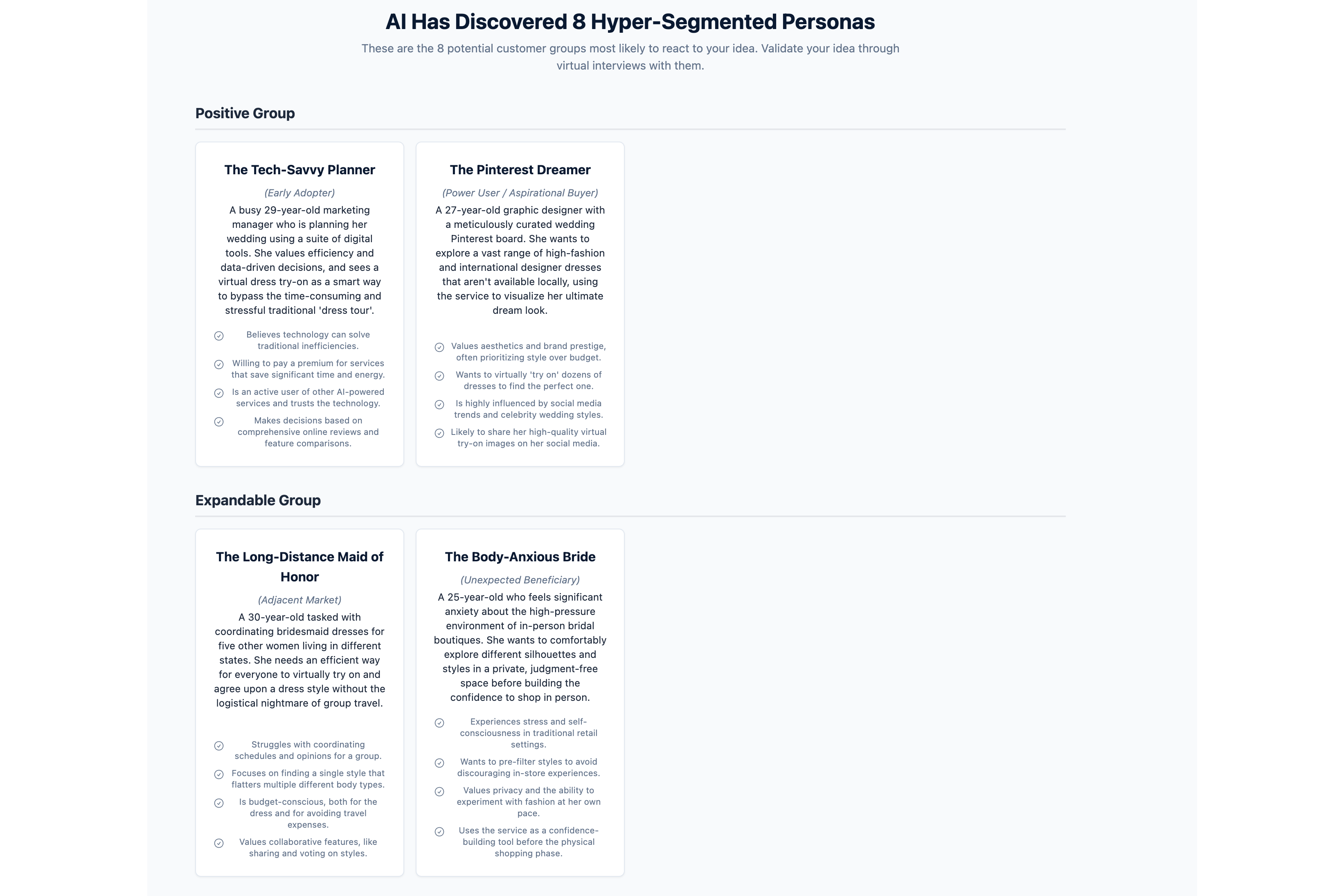 AI discovers 8 distinct customer personas for your idea. They are automatically categorized into strategic groups like Positive and Critical