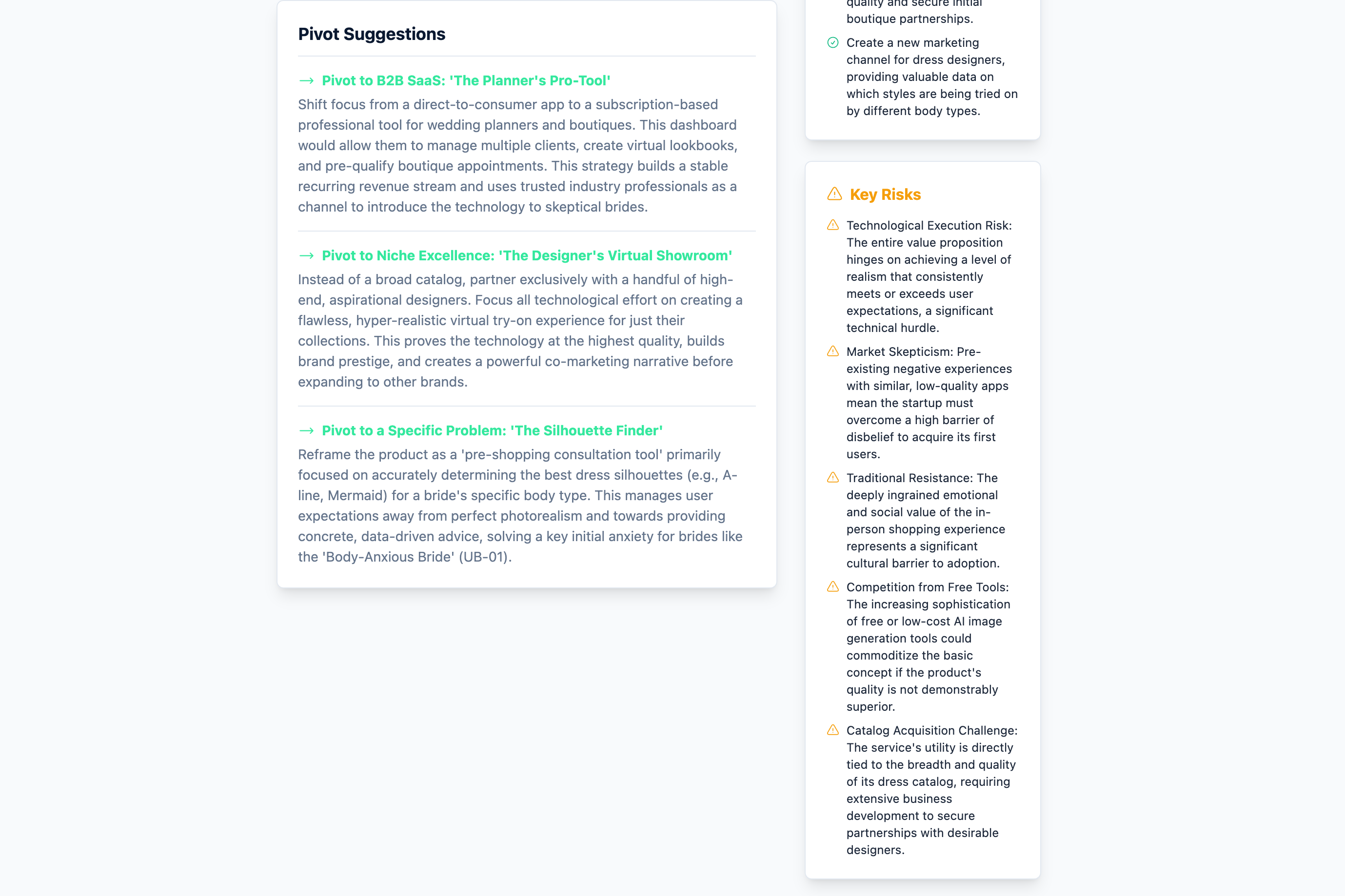 Get your prescription. Mapify delivers concrete pivot suggestions and a list of key risks, giving you an actionable path forward.