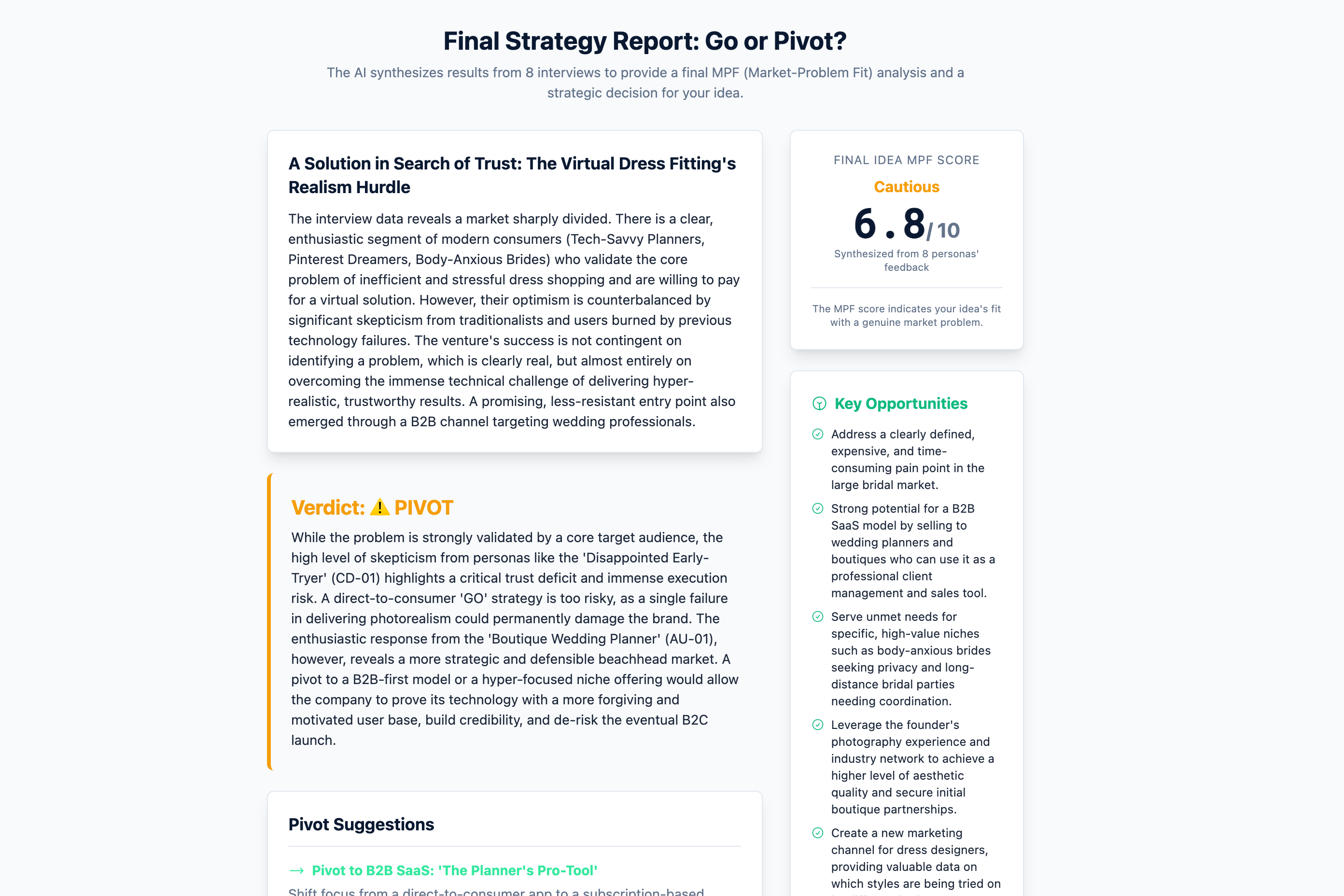 The AI synthesizes all data into a final verdict. Get your calculated MPF score and a clear, data-driven "Go" or "Pivot" recommendation.