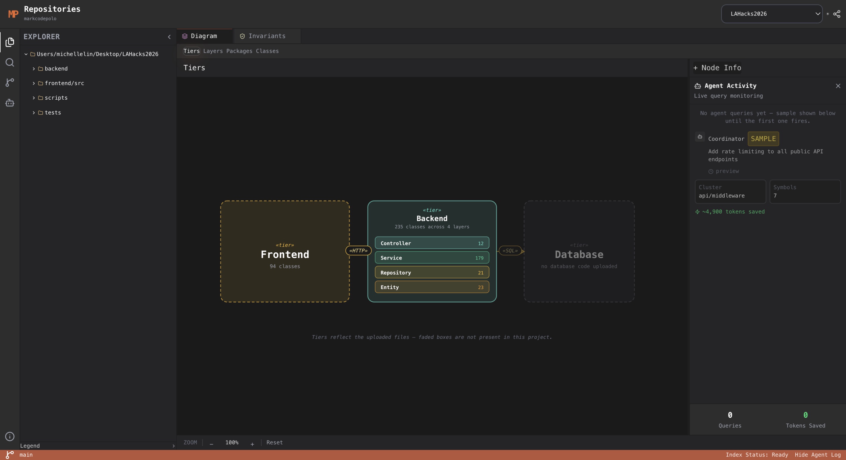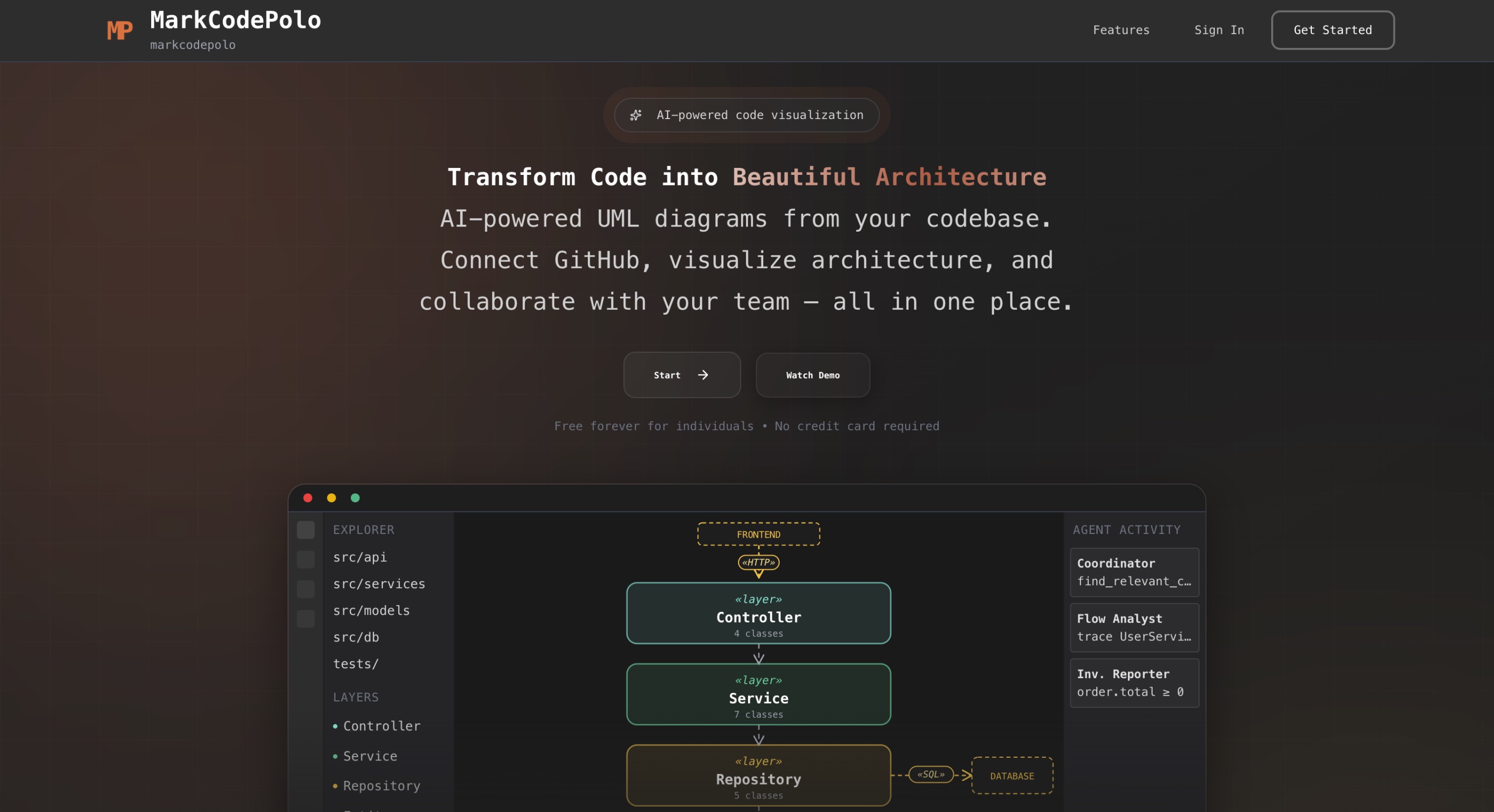 Large codebases are intimidating to navigate, both for human engineers onboarding to unfamiliar repositories and for AI coding agents that consume substantial token budgets retrieving context before producing useful output. The latter problem is structural: every time an agent reads source files to answer a question, it pays a cost in latency, dollars, and context window space. Existing tooling treats this as unavoidable. A second observation reinforced the first. Unified Modeling Language (UML) diagrams — visual representations of class hierarchies, component relationships, and state transitions — have long been the industry's answer to codebase comprehension. They fail in practice because they decay. A diagram drawn at the start of a sprint is stale by the end of it, and no engineer wants to redraw boxes and arrows after every refactor. MarkCodePolo was built at the intersection of these two problems. If a system can automatically extract structural relationships from a repository and present them as a navigable graph, it serves both audiences at once: human engineers get a living architectural map, and AI agents get a compressed structural index they can consult instead of grepping through thousands of files.