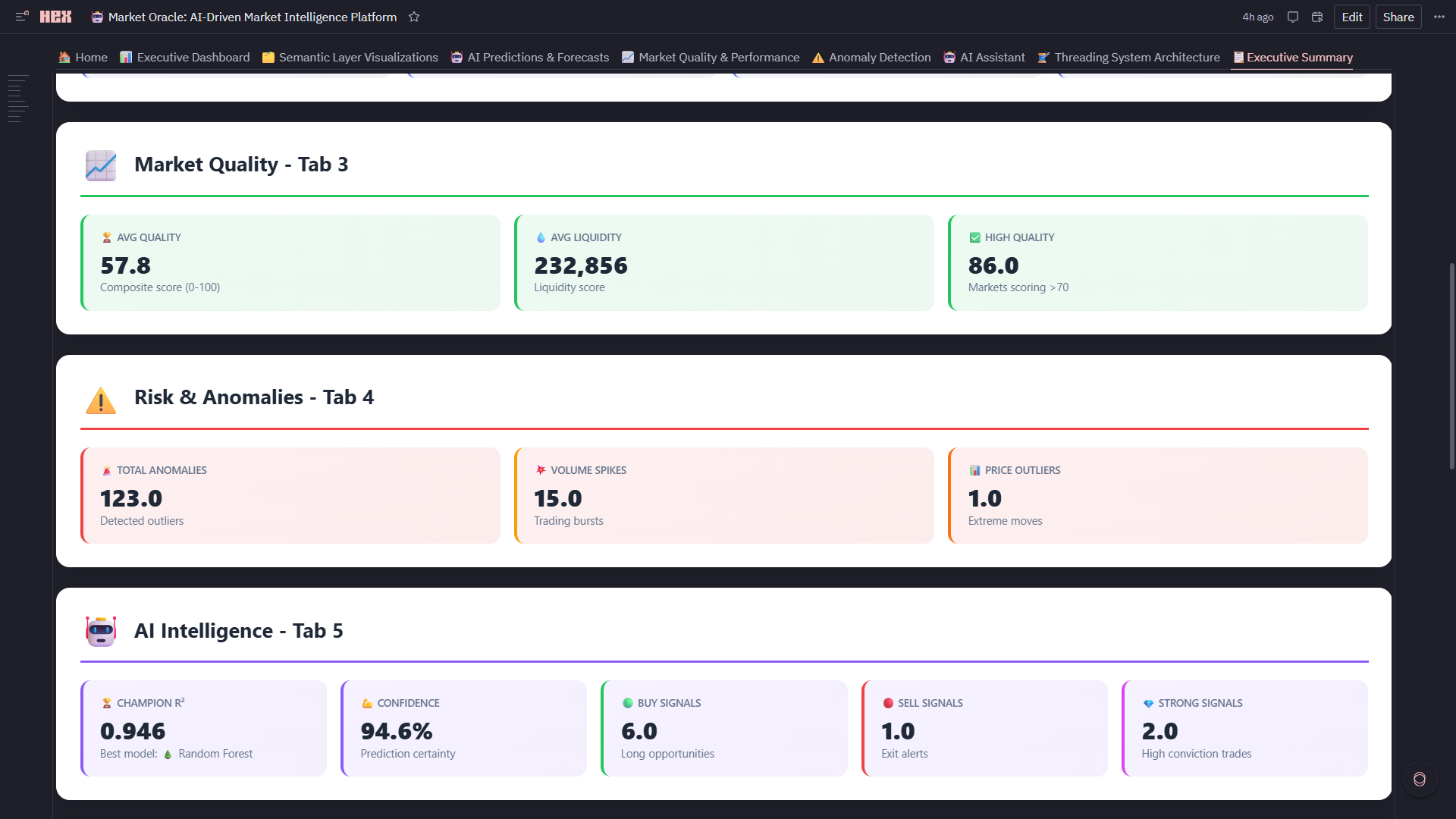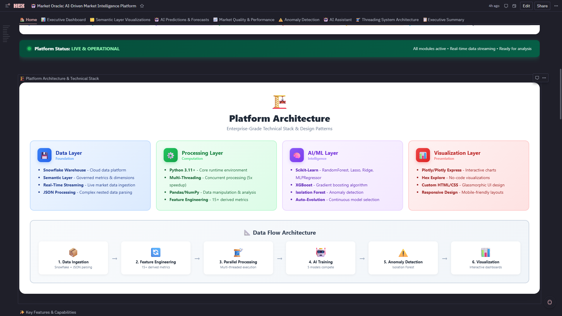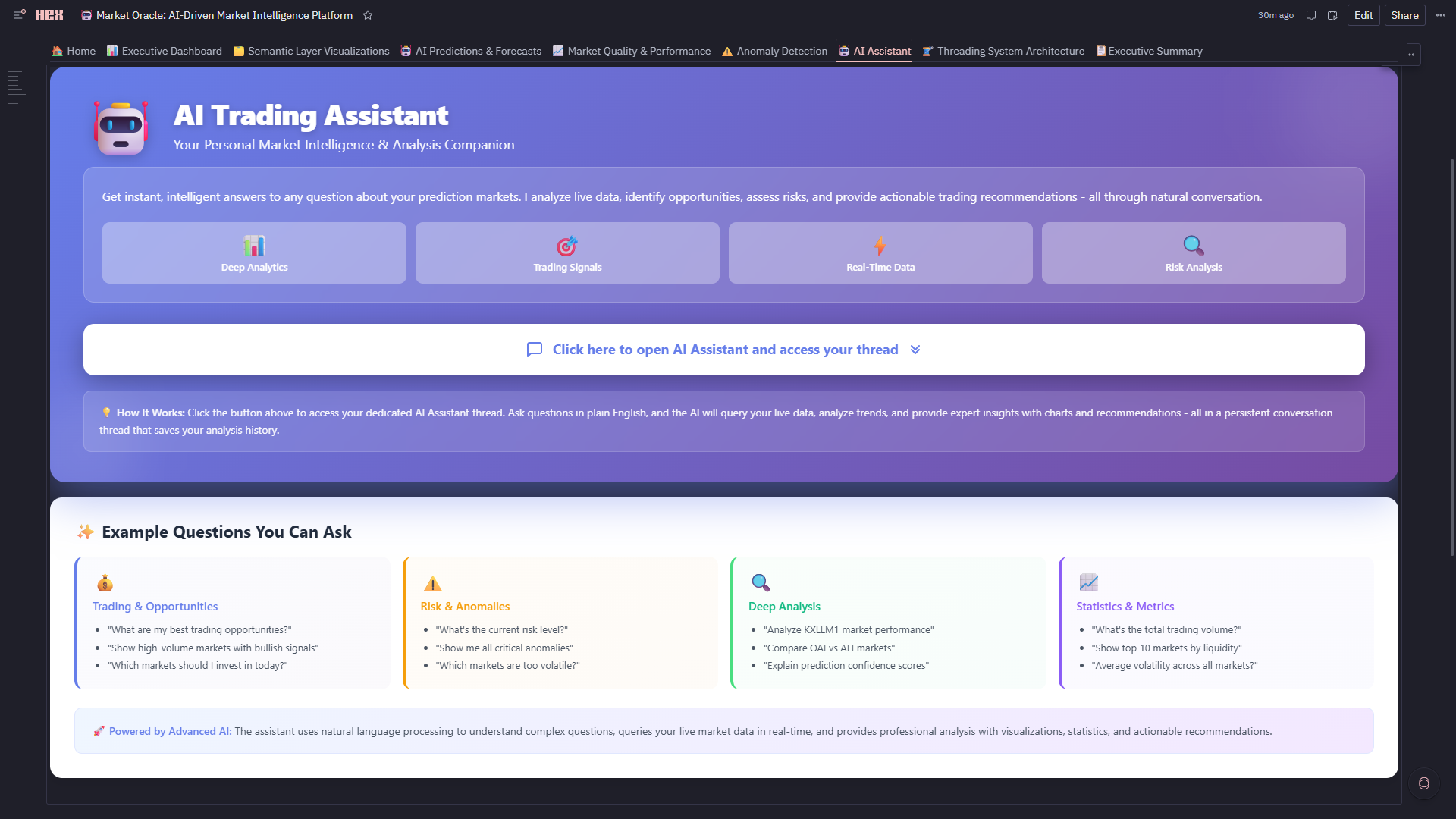 - Hex Threads Integration: Dedicated persistent thread connected to live Market Oracle dataframes, semantic metrics, ML predictions, anomalies, and trading signals