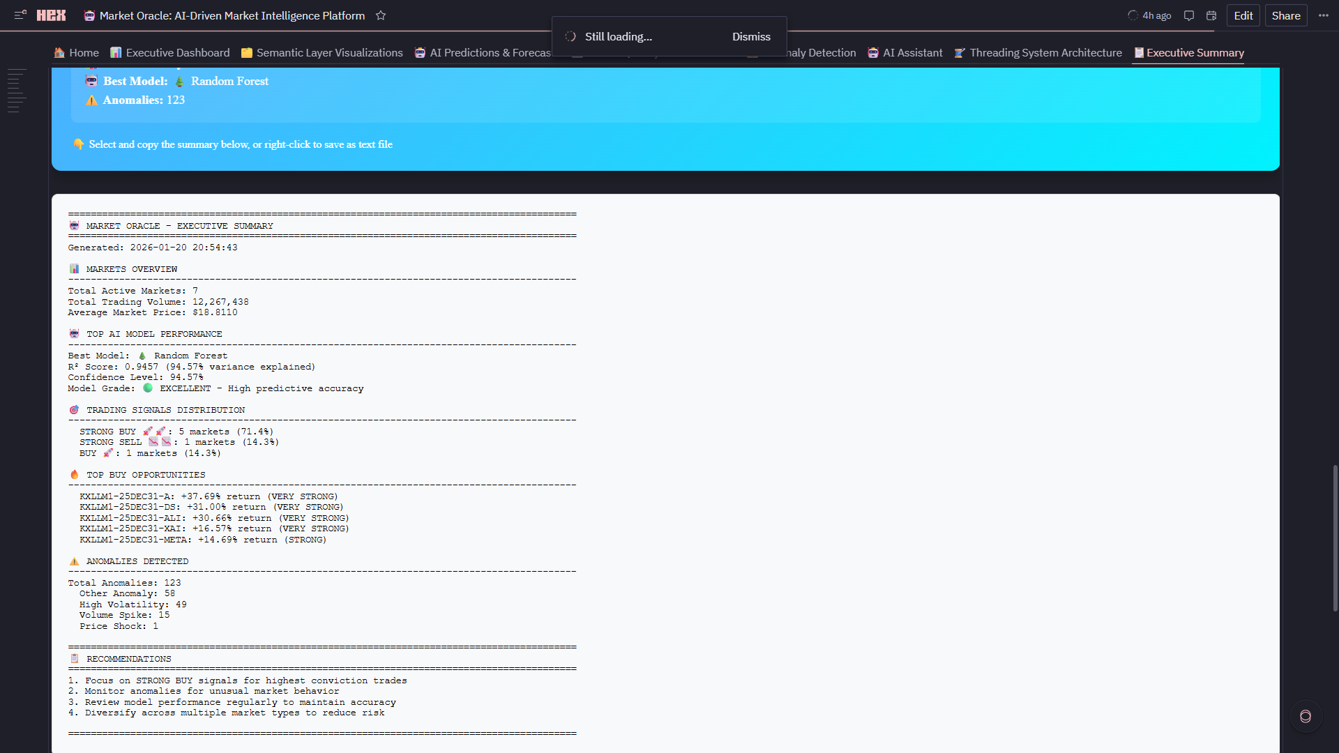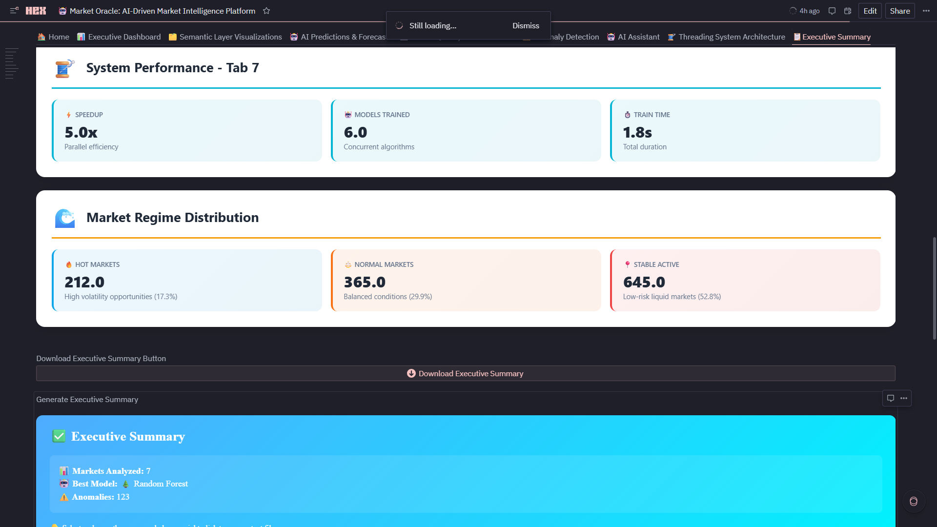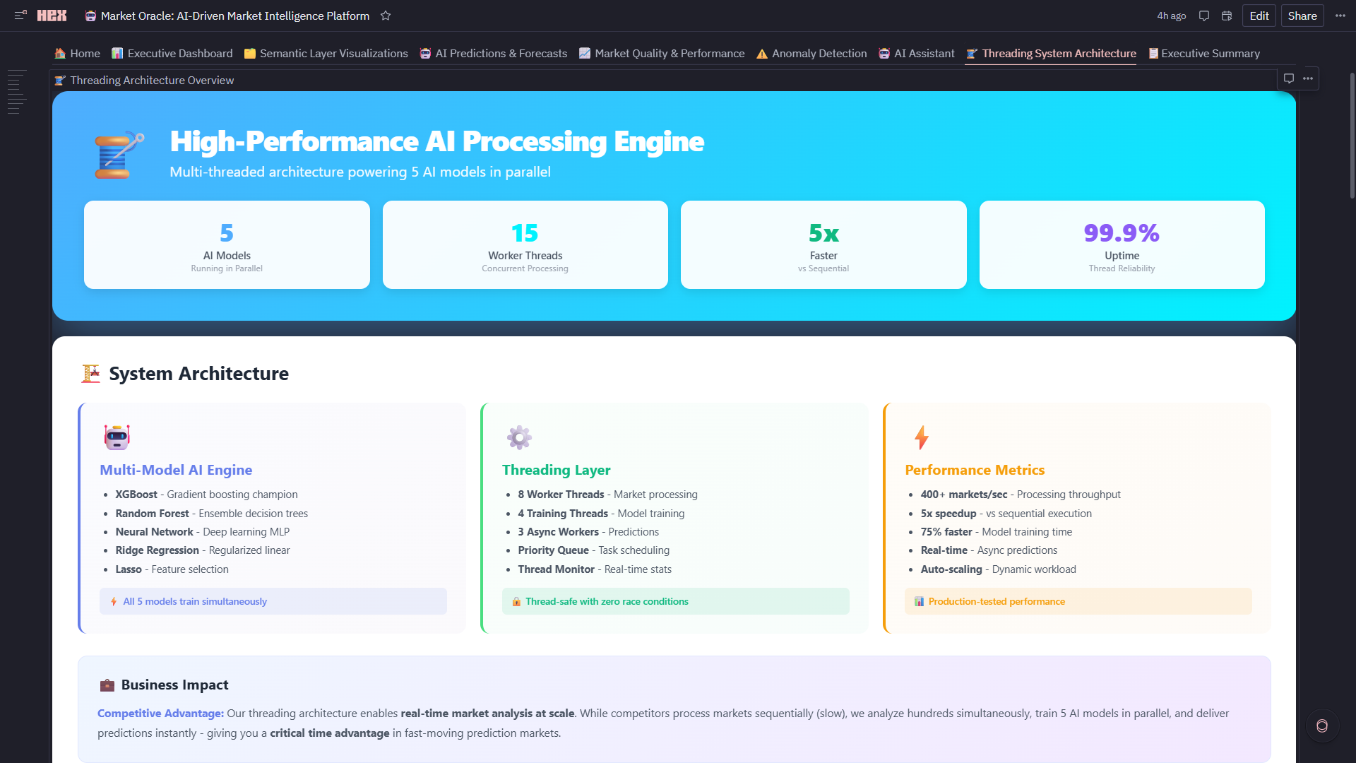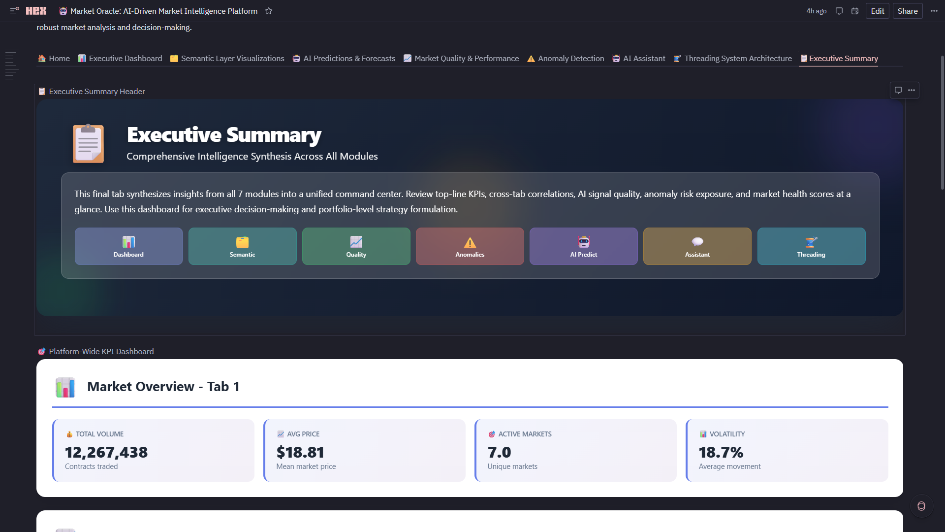- Hex Threads Integration: Dedicated persistent thread connected to live Market Oracle dataframes, semantic metrics, ML predictions, anomalies, and trading signals