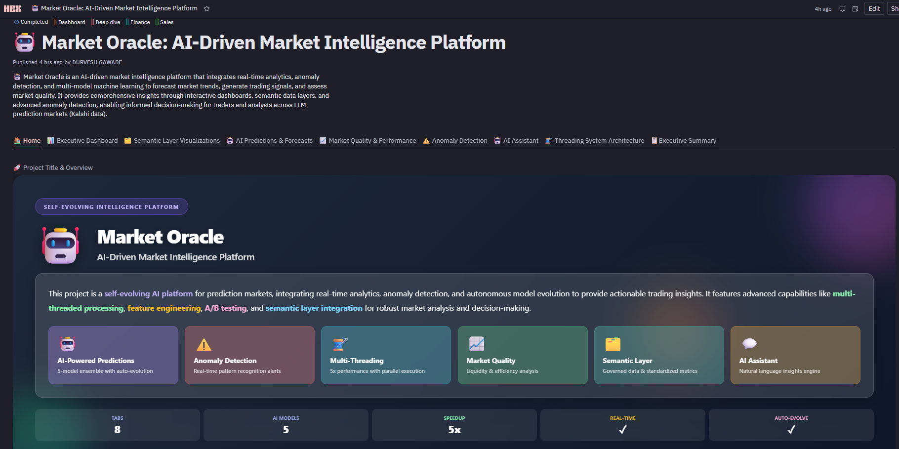 10. AI Assistant & Threaded Conversational Intelligence I built a stateful AI assistant using Hex Threads that operates directly on Market Oracle’s live dataframes, semantic metrics, ML predictions, anomaly detection outputs, and trading signals. Unlike stateless chatbots, the assistant preserves analytical context across multi-turn conversations, enabling reproducible, audit-ready market analysis with consistent metrics. This unified the platform’s dashboards, machine learning, and governed data layer into a single conversational interface that delivers real-time insights, visualizations, confidence scores, and actionable trading recommendations in a production-grade workflow.