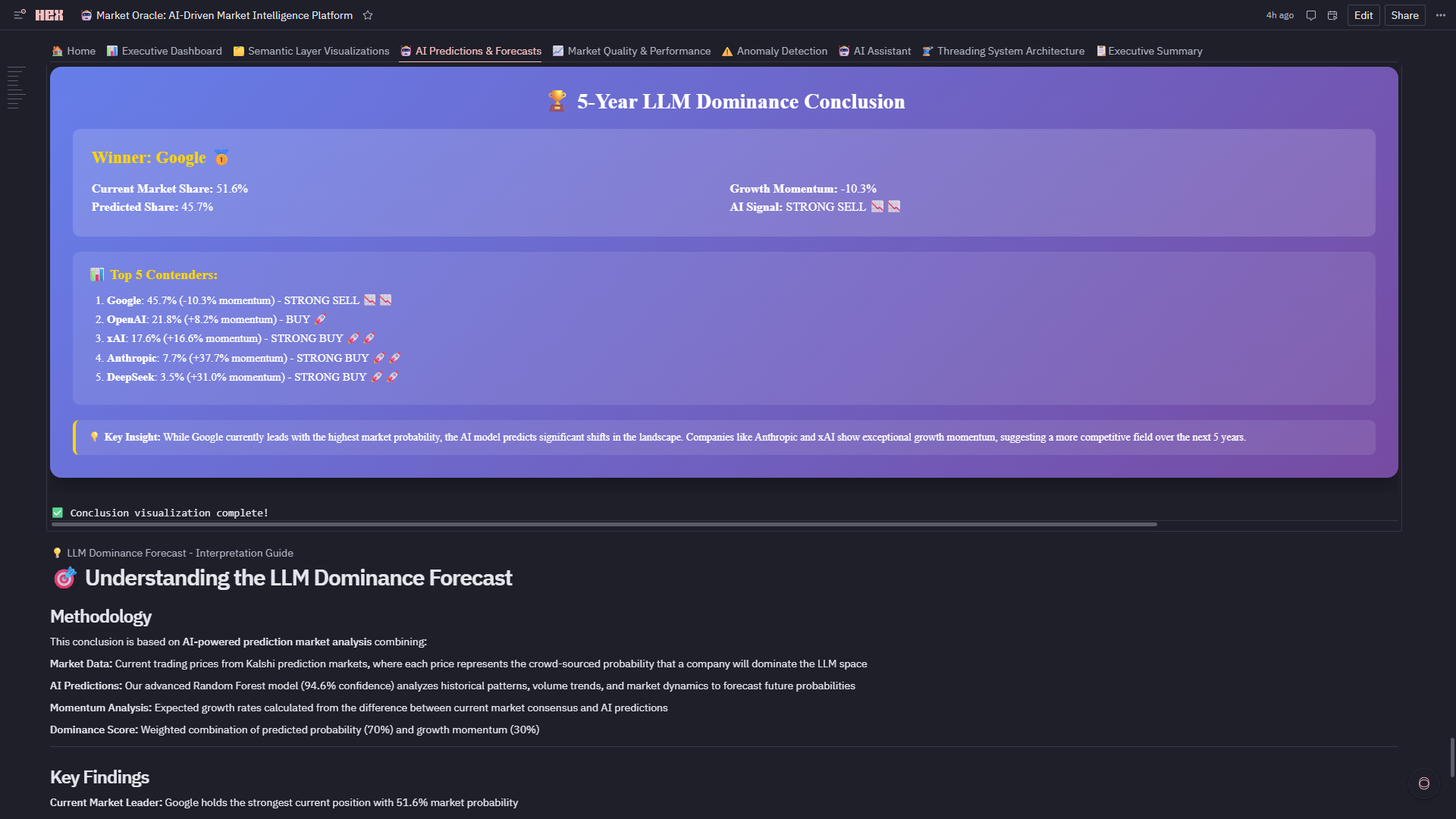 1. Zero-to-Production in One Environment Built a complete enterprise analytics platform—from raw data ingestion to interactive dashboards to downloadable reports—entirely in Hex without leaving the notebook. No separate BI tool, no front-end framework, no deployment pipeline. The entire stack (Test Warehouse Connection: Snowflake → 🧹 Data Cleaning & Quality Control: cleaning → Create Semantic Tables: semantic modeling → Multi-Model Training Engine: ML training → 📊 Executive Dashboard-💡 LLM Dominance Forecast : 8-tab app) lives in a single artifact that's simultaneously code, analysis, and product.