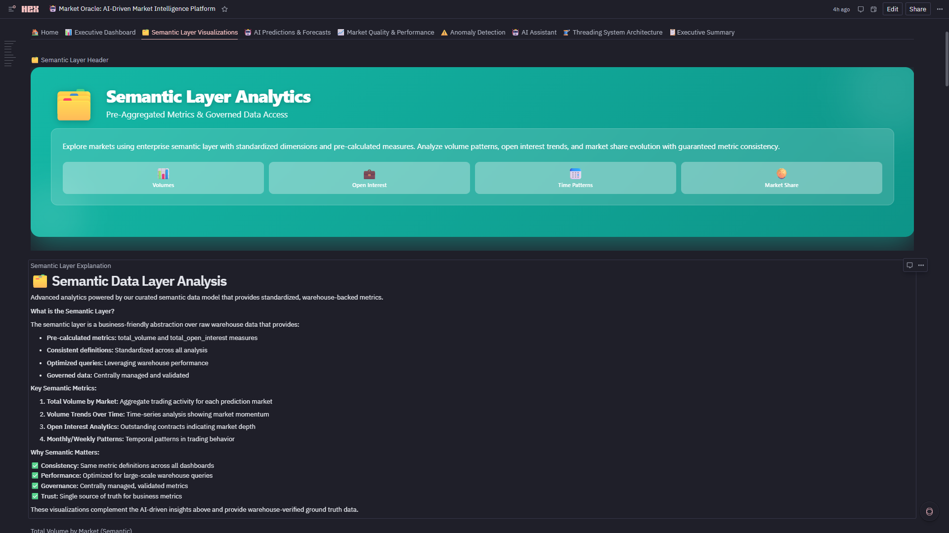 6. Semantic Layer That Actually Scales ** Built dimensional model (dim_market, dim_time, fact_table) with governed metrics powering 12 charts. The accomplishment: zero metric drift. When Total Volume by Market (Semantic) shows total_volume and Volume Trends Over Time by Market shows total_volume, they're pulling from **identical definitions—not two analysts with two queries getting two different numbers. This is governance that doesn't sacrifice speed.