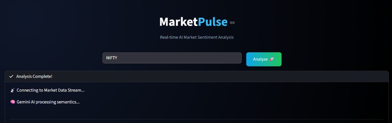 Market Pulse analyzes real-time financial news related to a stock or index and determines the overall market sentiment. It produces a sentiment label (positive, negative, or neutral), a numerical sentiment score, and the number of articles analyzed to give users a concise market overview.