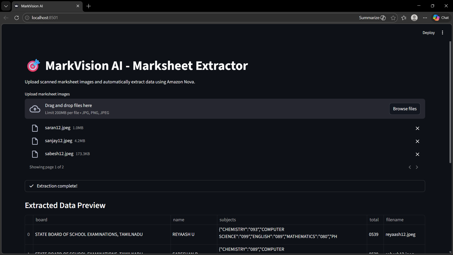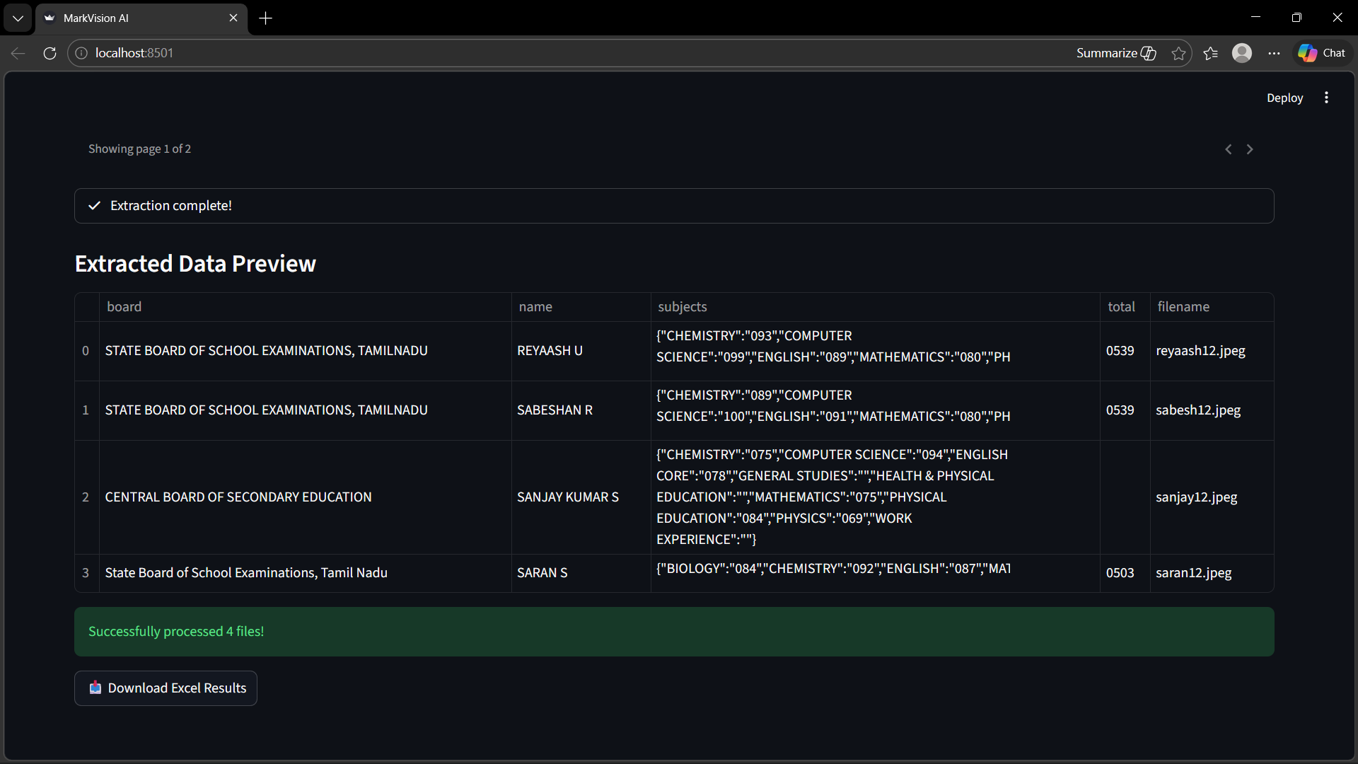 MarkVision AI is an intelligent marksheet data extraction system. Users could upload one or more images of their marksheets and the application automatically analyzes their marksheets to extract important information such as education board, name of the student, subjects, marks obtained by individual subject, and total marks. The information extracted is then structured and exported in the form of an Excel file. The system supports marksheet from boards such as CBSE, Tamil Nadu State Board, etc. Institutions can quickly and accurately convert the unstructured documents to structured data through this system.