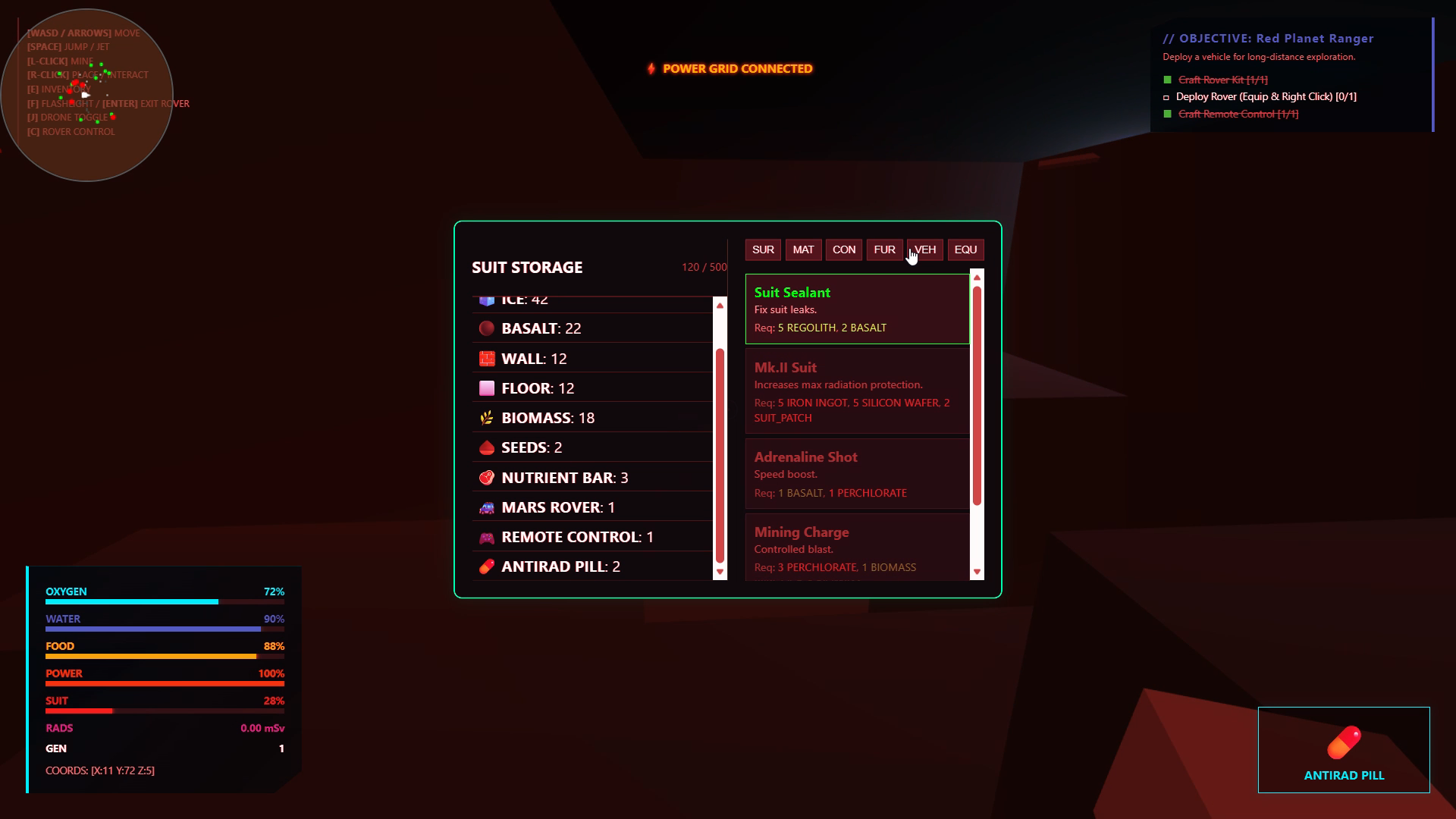Gemini 3.0 Pro was central to development in Antigravity IDE. It generated the code based on instructions and information related to Mars. We started with the main architecture (a static website for github pages) and from there we started to explain the mechanics. For example, for crafting, I explained combining regolith and water for oxygen. Gemini built the logic, inventory, and UI updates. It connected systems like oxygen to life support and radiation to biomes.