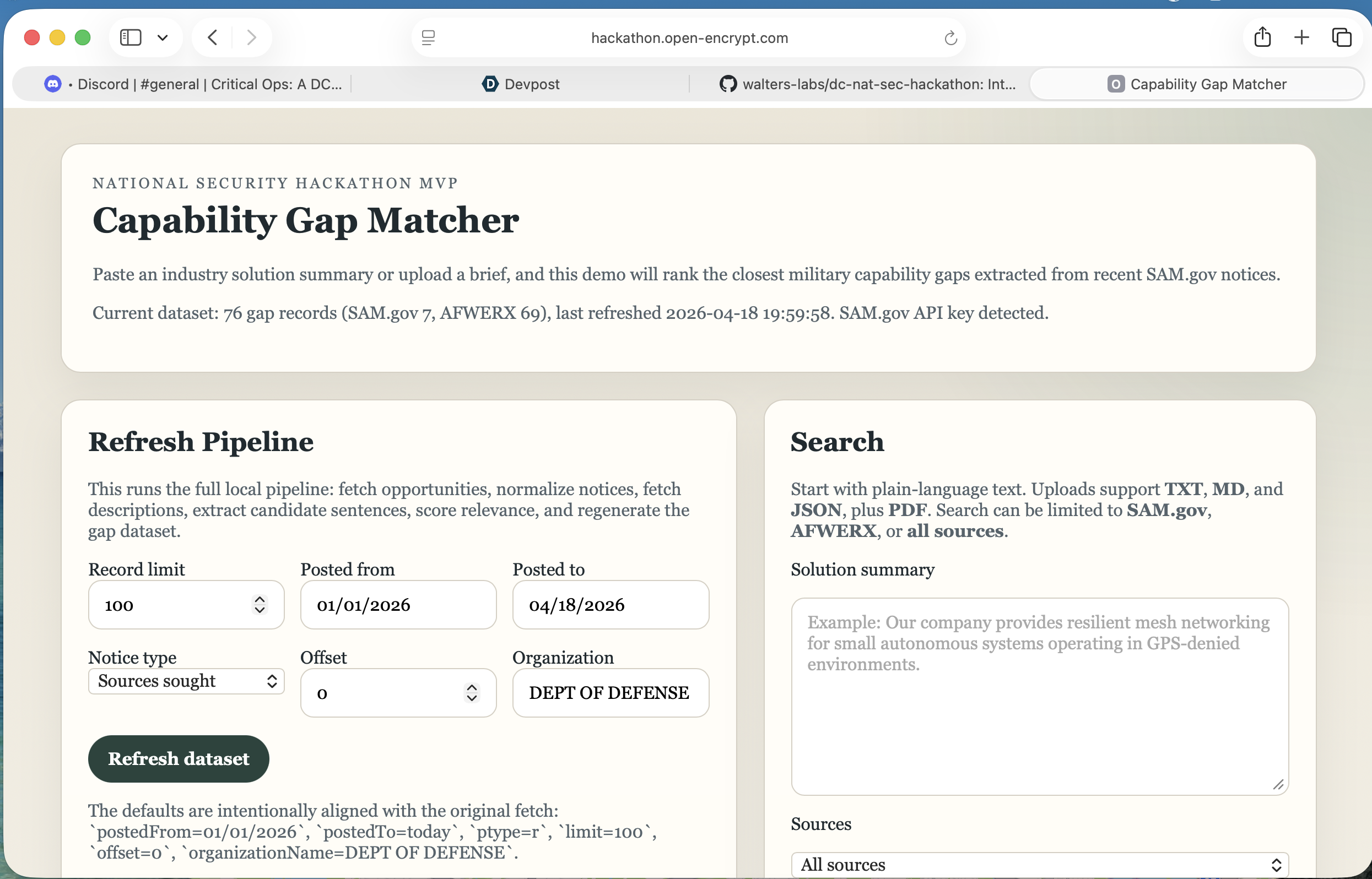This is currently a search engine which allows the user to type in an industry solution and receive a ranked list of military capability gaps. The capability gaps are sourced from SAM.gov and AFWERX