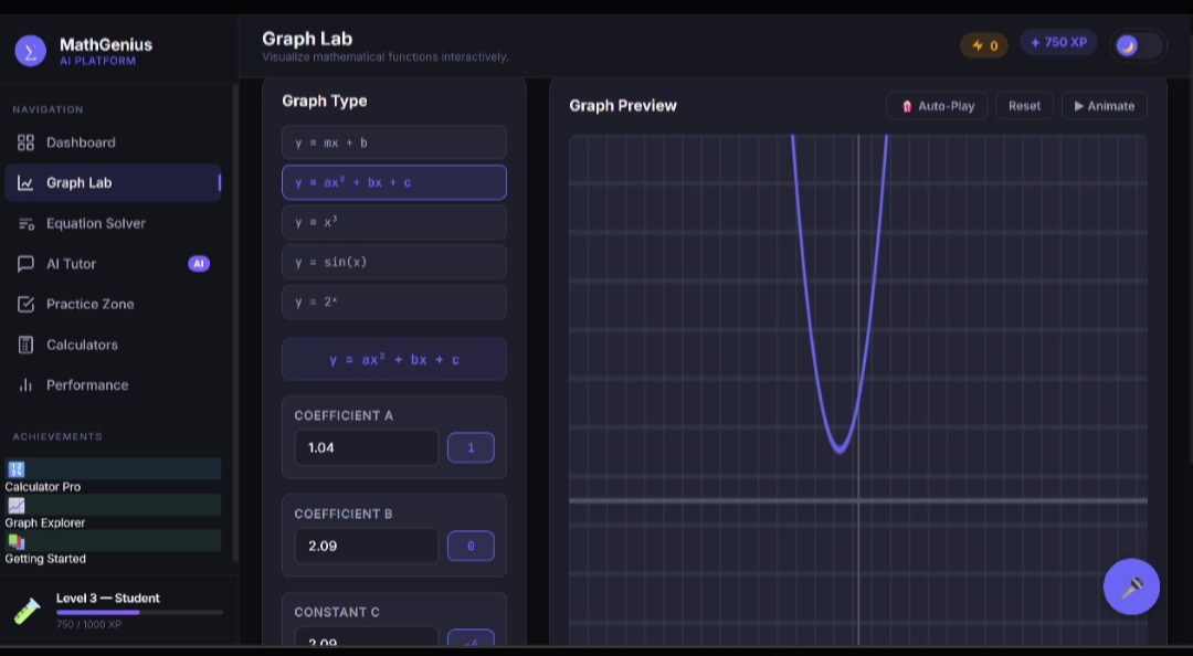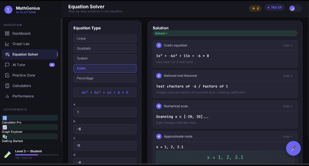☆ MathsMind AI is an interactive platform that helps users solve math problems using voice commands, learn concepts with an AI tutor, visualize graphs, and use real life calculators like EMI, budget, and savings. It also gamifies learning with XP, levels, and progress tracking to keep users engaged.