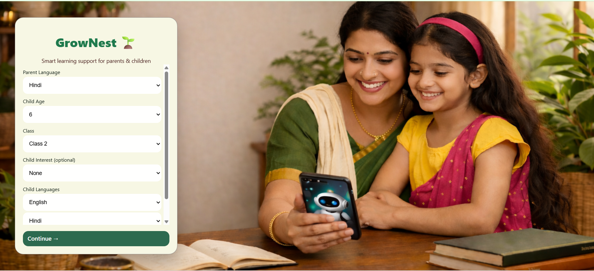 GrowNest enables calm, confidence-first learning at home by helping parents guide their children with AI and native-language support.