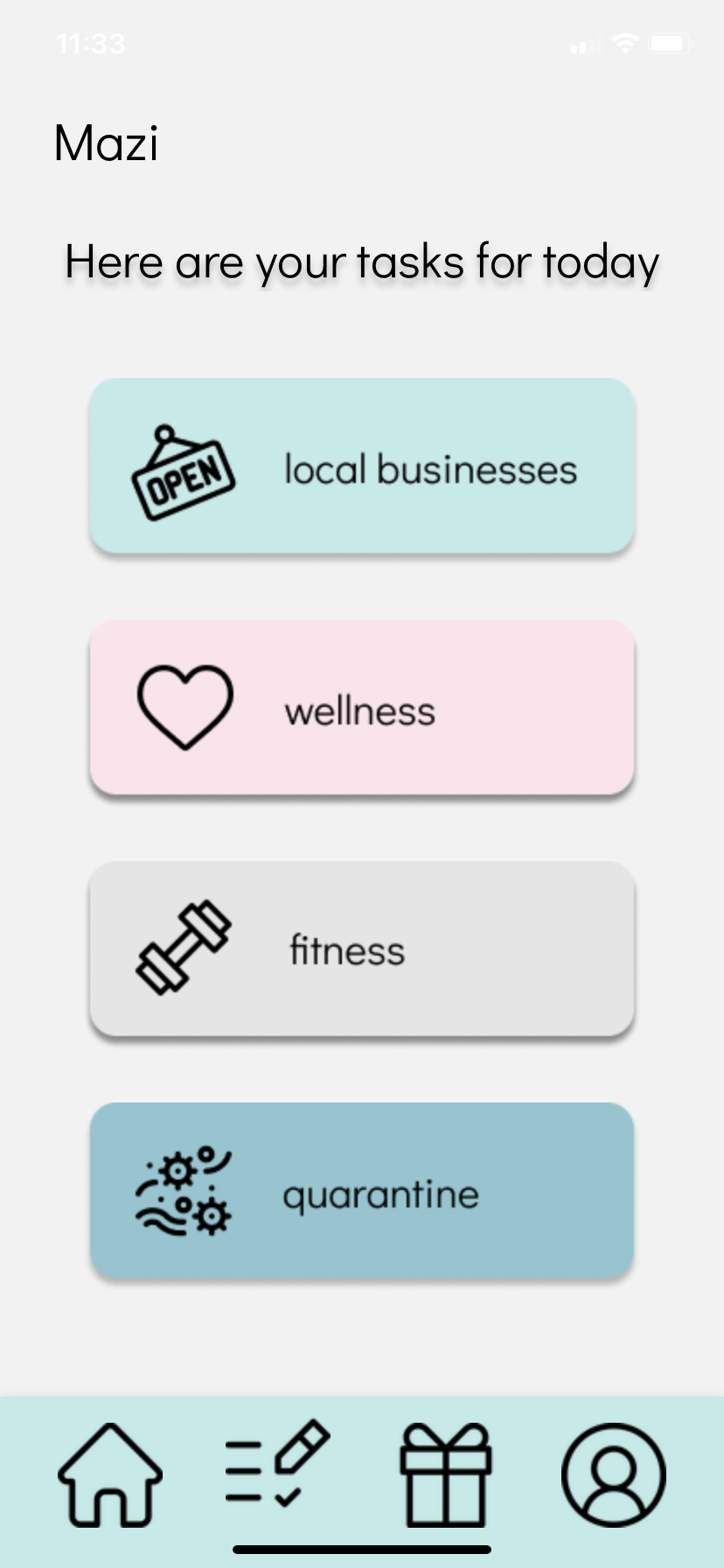 Within Mazi, there are four categories users can choose from: local businesses, wellness, fitness, and quarantine. Each category consists of a few tasks regarding that chosen theme.