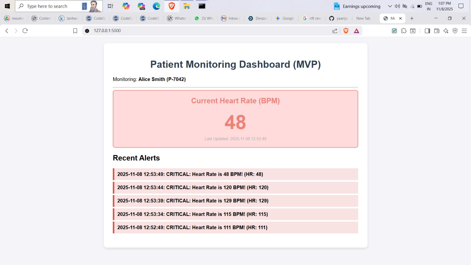 Functioning End-to-End Prototype: We delivered a complete, working solution that successfully simulates an IoT device, processes data in a backend, applies critical logic, and visualizes the results on a real-time web dashboard. Demonstrating Core HealthTech Functionality: We implemented the foundation for a life-saving system—the ability to turn passive vital sign data into proactive, actionable alerts. Simplicity and Speed: We built a fully operational web application using minimal dependencies in a short amount of time, demonstrating the technical feasibility and speed of our Python-based approach.