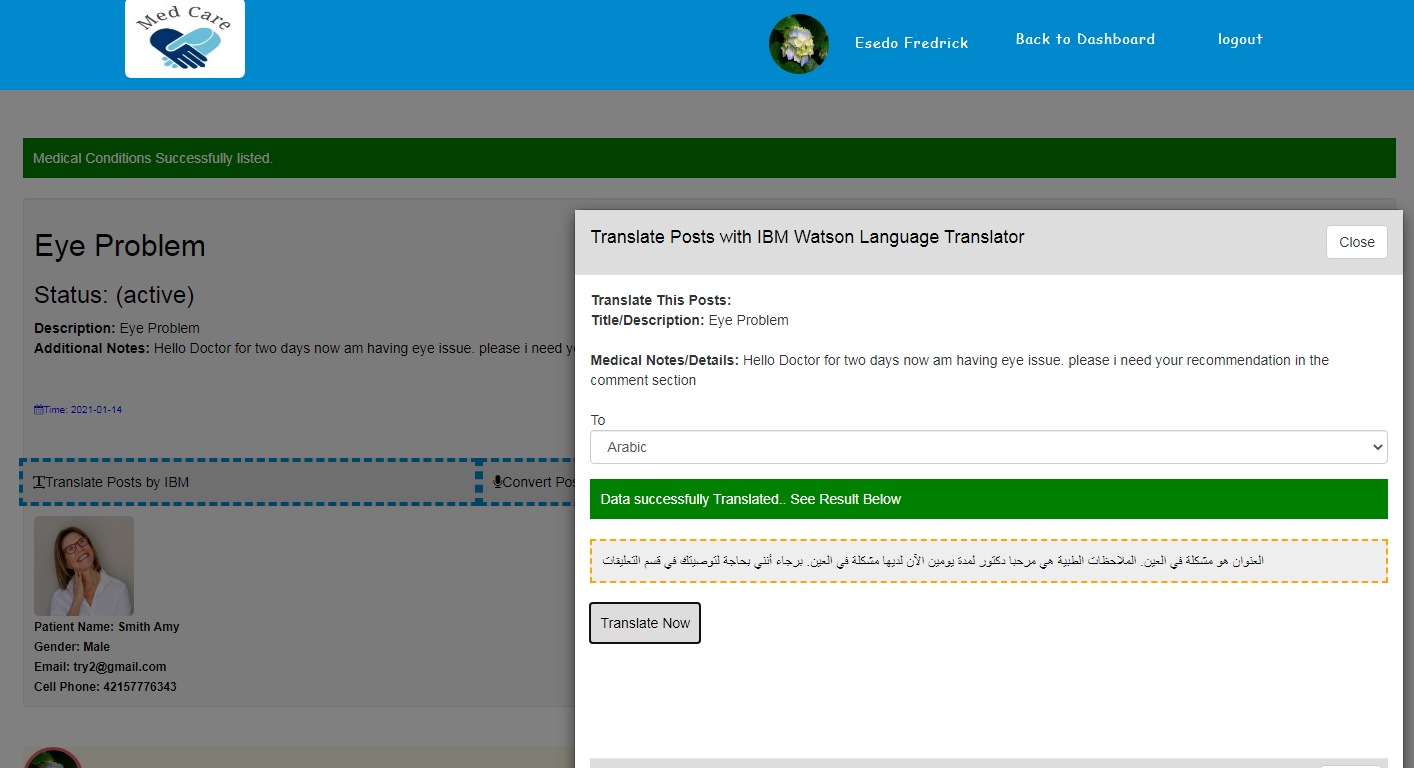 For instance, Doctor can used IBM Language translator to translate any Published Medical Status/Problems Updates to any Language of Choice for better understanding of what the Medical Problem is all about and then find a way to provide a Medical Recommendations in the comments sections for that Medical Problem Updates.