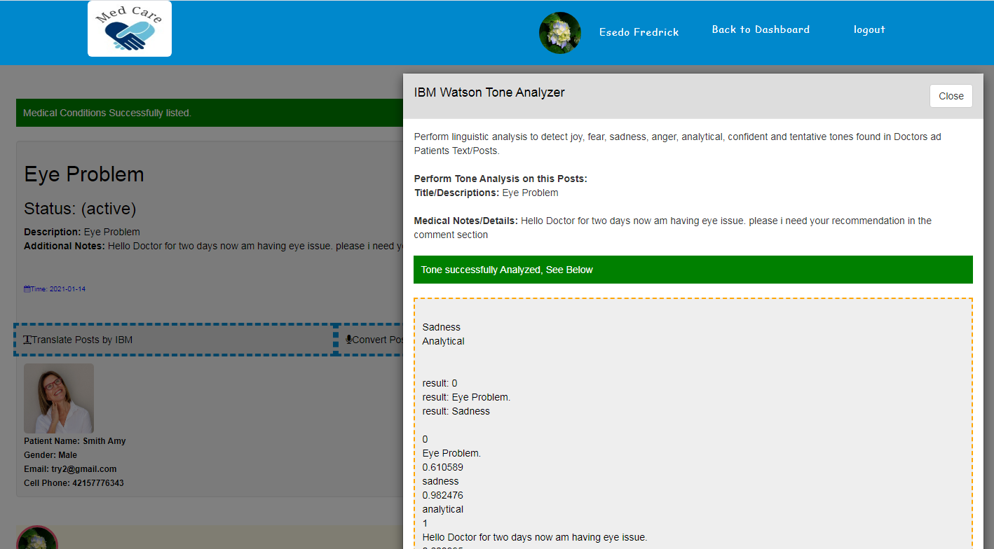 IBM Watson Tone Analyzer helps the Medical Teams(Doctors) to Perform linguistic analysis to detect joy, fear, sadness, anger,